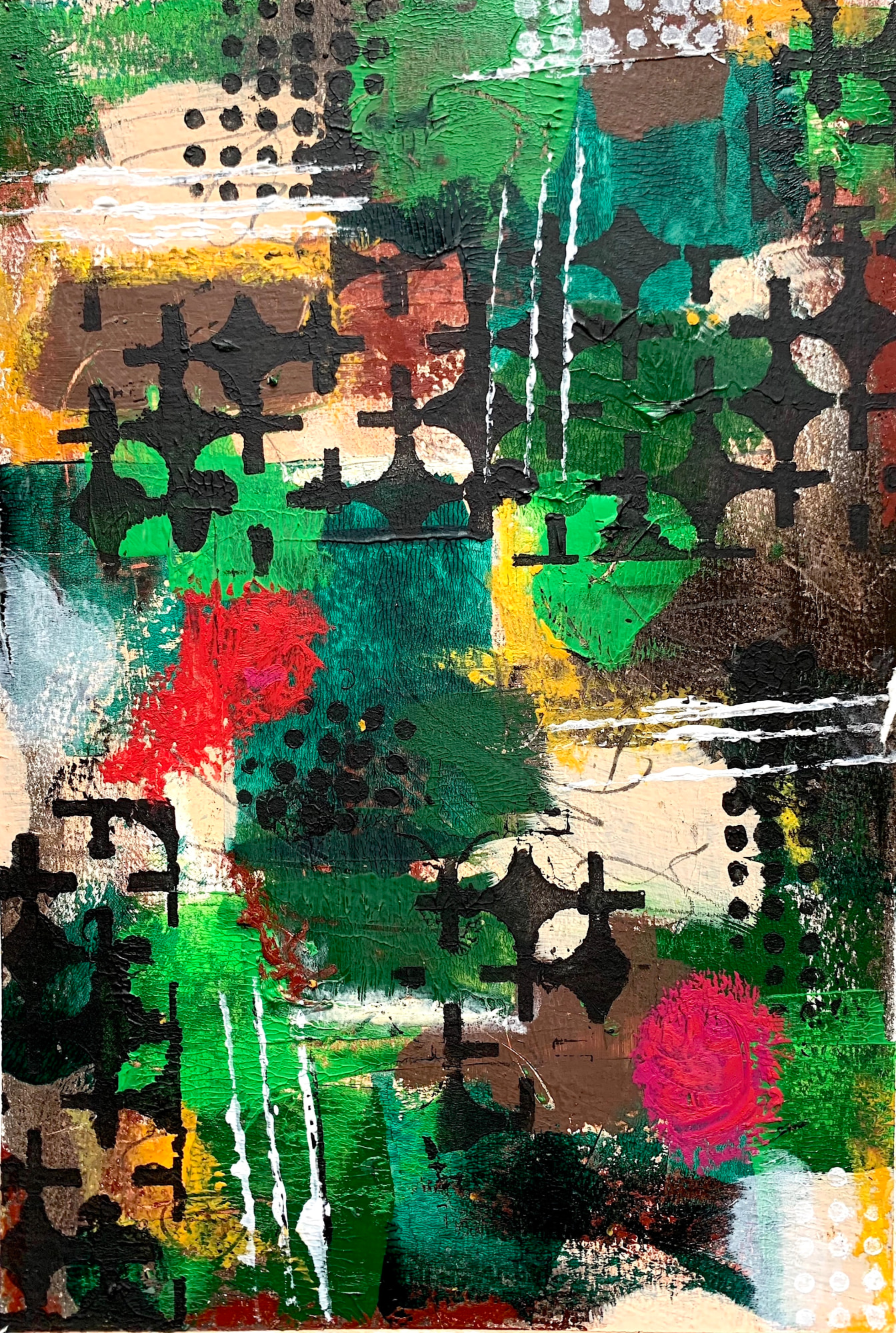 Original Abstract using acrylics, soft oil pastel and charcoal pencils on watercolor paper.