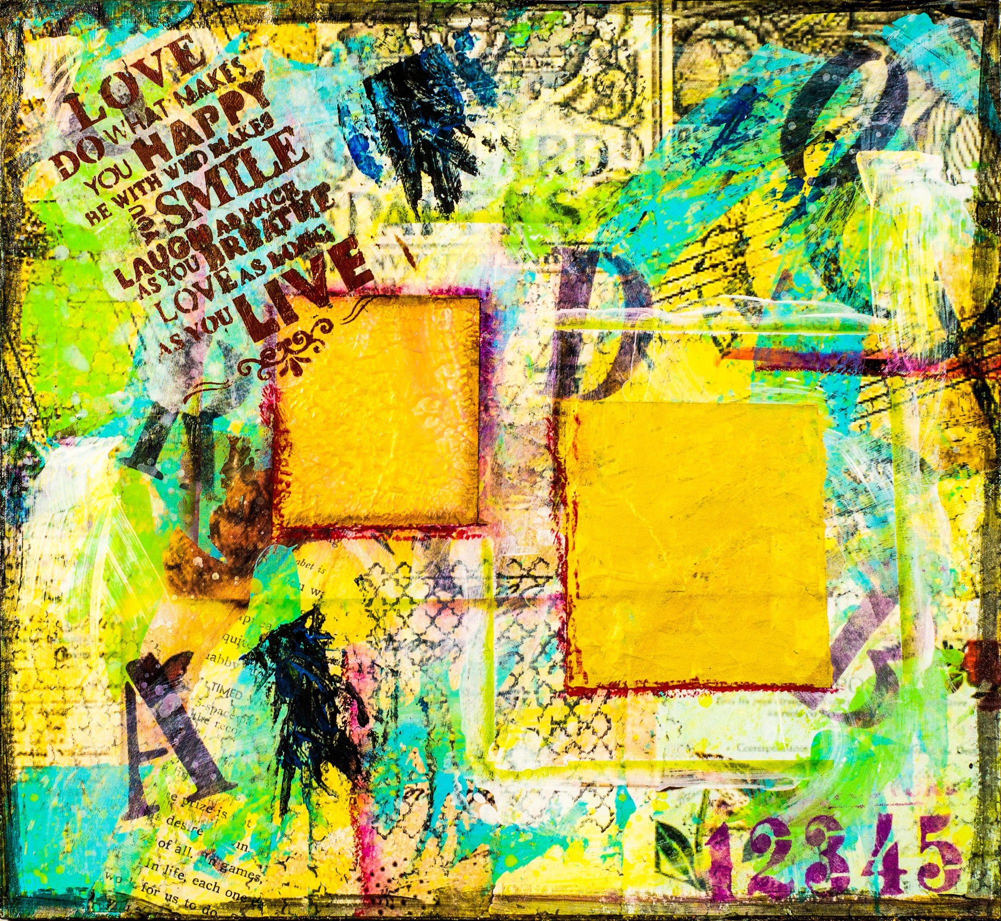 - Subject Matter: Abstract, collage, acrylic, stencil, collage paper, stamping, printed tissue