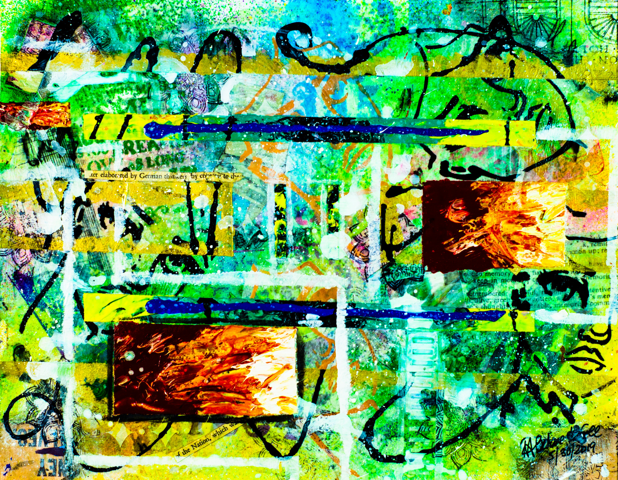Original Abstract collage artwork using acrylic with printed tissue, collage paper and stenciling on mixed media paper.