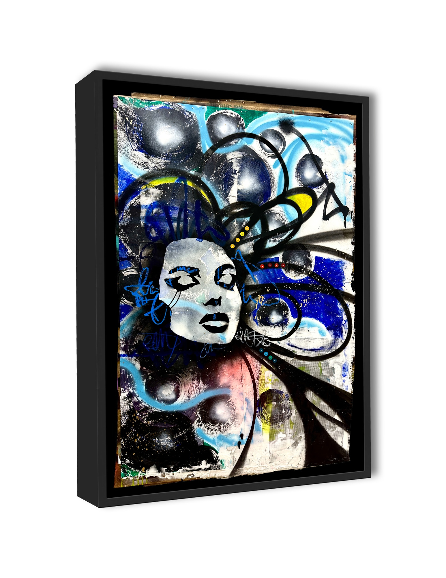 Mixed media includes acrylic, spray paint, vintage beads, window screen, tile adhesive, nails, and screws