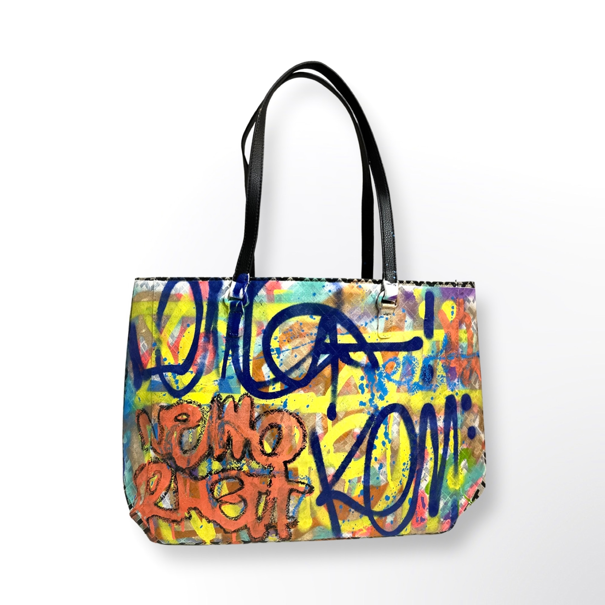 Hand painted, one of a kind, acrylic, spray paint and oil marker on tote bag.