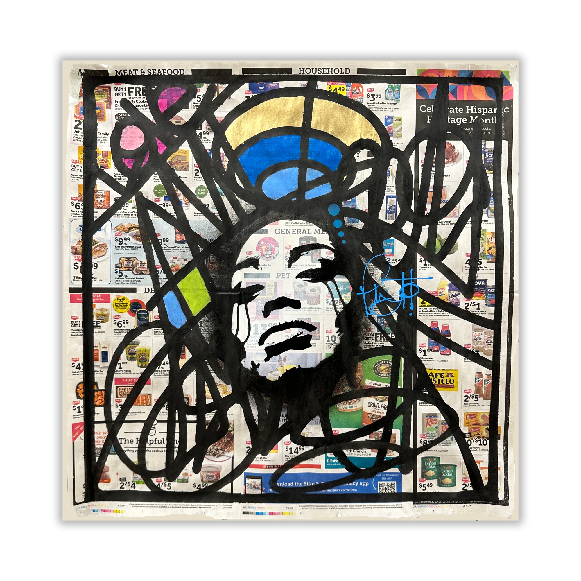 Acrylic, Spray Paint, Oil, and Wax on Newspaper