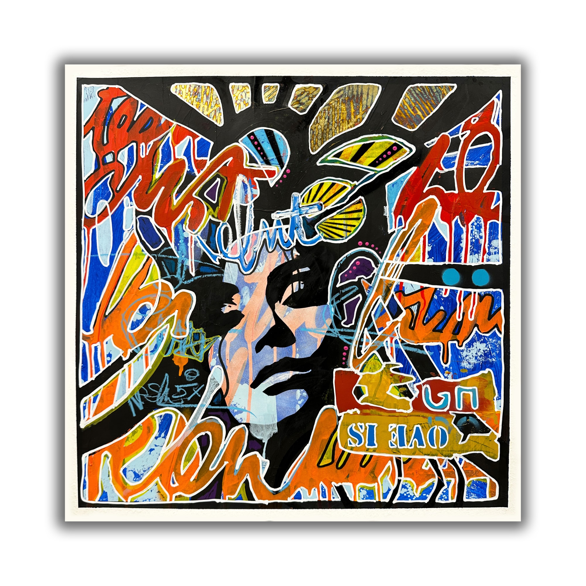 Acrylic, Spray Paint, Oil, Variegated Gold Leaf, and Wax on Paper