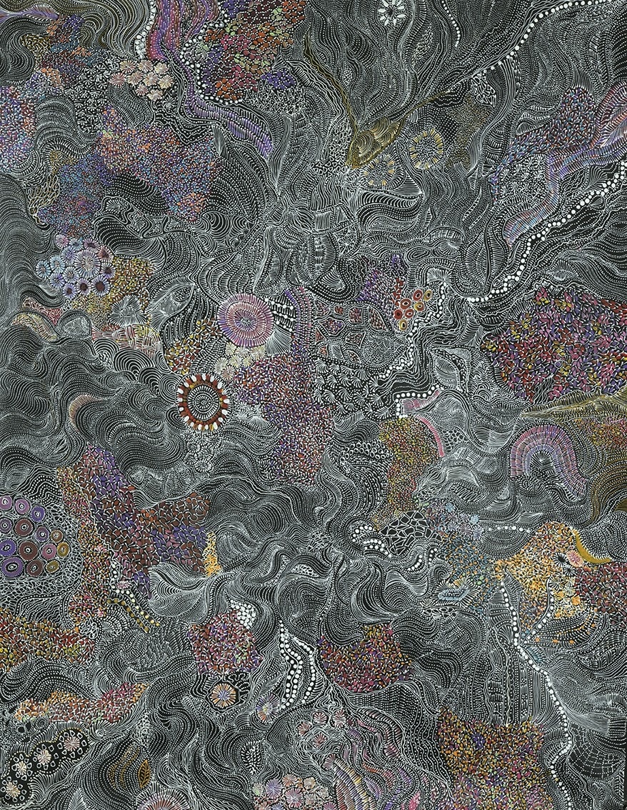 Les motifs de cette toile s’inspirent de « son pays », la terre dont elle est la gardienne. Abie symbolise ici la vie qui parcourt cette région en représentant les plantes, les rhizomes, les graines, les feuilles médicinales.