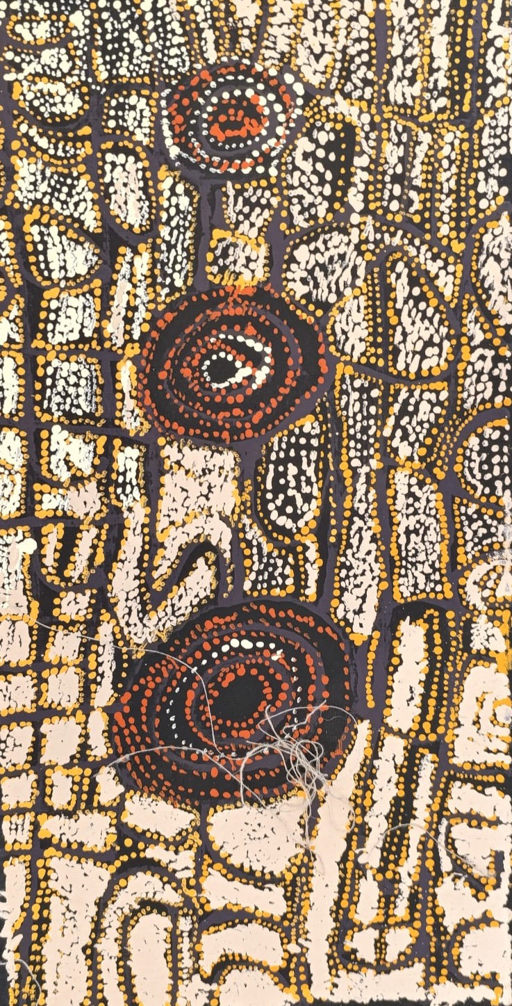 Cette oeuvre décrit le site de Mina Mina, un site tout aussi important pour les hommes que pour les femmes. On y vient de loin pour réaliser des cérémonies. Les cercles concentriques représentent les points d’eau. Les points symbolisent les fruits et les baies (patates sauvages et tomates sauvages) que les femmes vont collecter.
