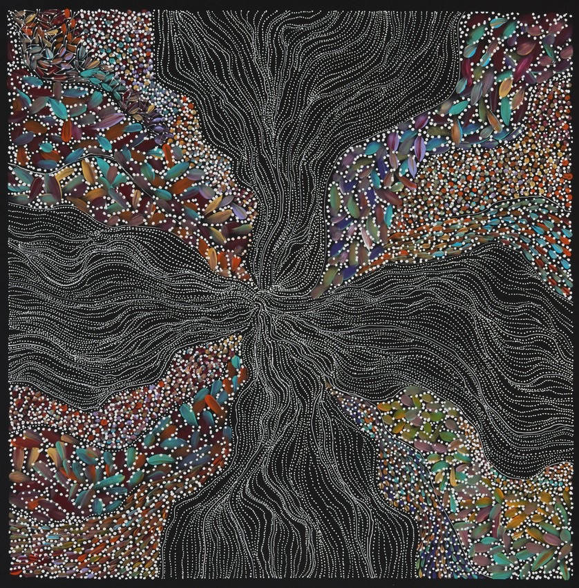 Les motifs de cette toile s’inspirent de « son pays », la terre dont elle est la gardienne. Abie symbolise ici la vie qui parcourt cette région en représentant les plantes, les rhizomes, les graines, les feuilles médicinales.