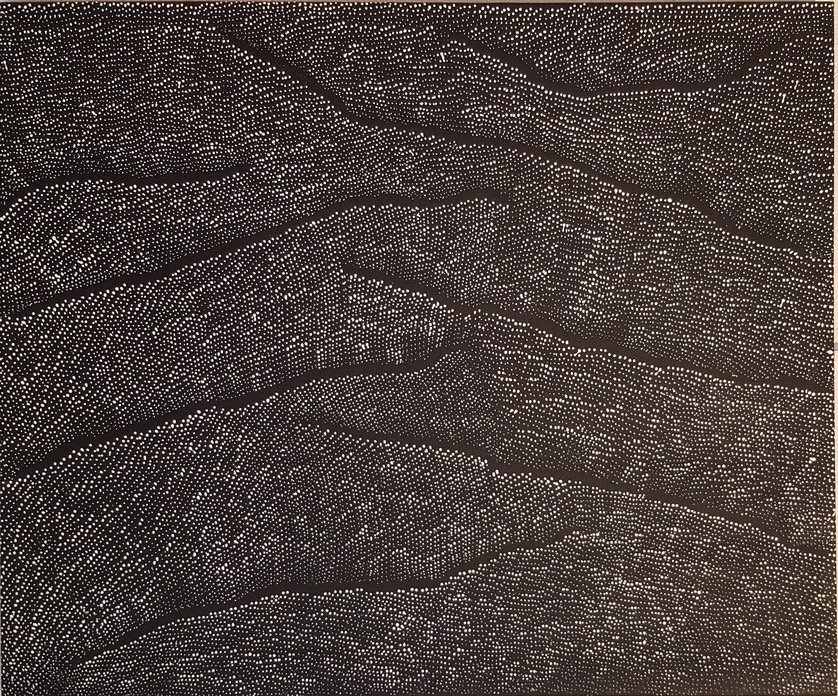 Lilly a créé la surprise en modifiant sa façon de peindre. A l’aide de points très fins et de tailles différentes elle décrit avec un minimum de teintes les dunes de la région de Kintore et de Conniston, le vent et le désert après la pluie. Il en résulte des œuvres mystérieuses aux puissants effets visuels dont cette toile est la parfaite illustration.