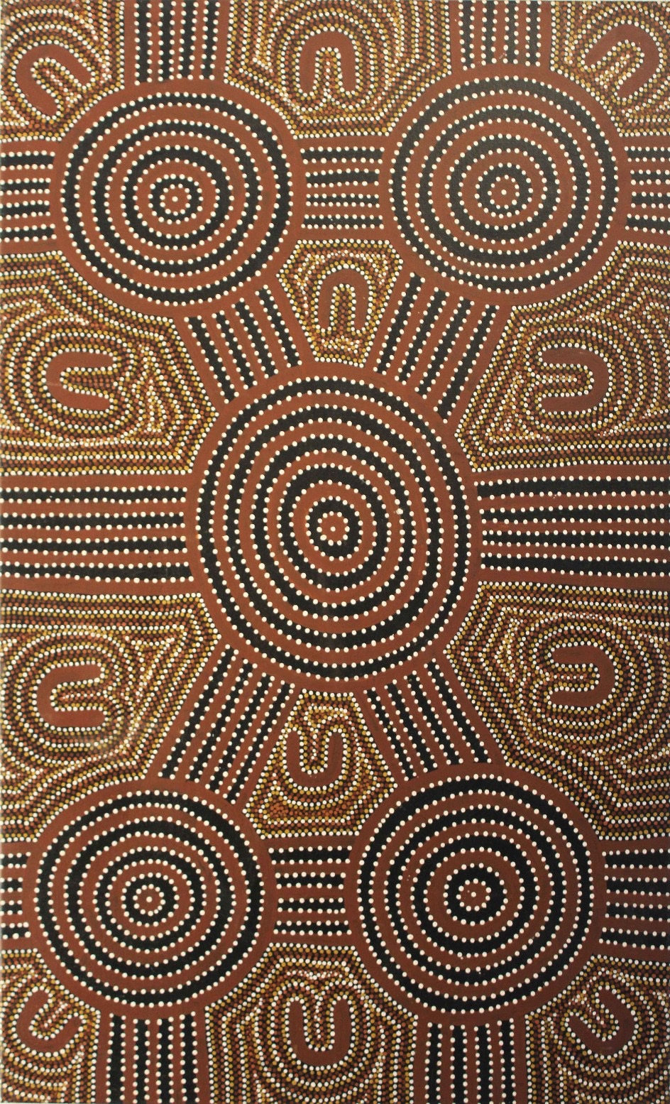 Le style de Johnny, comme celui d’autres artistes de sa communauté, se joue entre figuratif et abstraction. Parfois, les motifs traditionnels — symboles, lignes, points, formes circulaires — se mêlent à des compositions plus larges, où la couleur, l’espace, le geste prennent une grande importance. On y trouve une forte sensibilité au territoire : à la couleur du ciel à l’aube ou au crépuscule, à la lumière sur la terre rouge, aux contrastes entre ombre et lu mière, à la saison des pluies qui transforme le paysage. Le rythme du pin ceau, le rythme des couches de peinture, la texture, deviennent autant de fa çons de rendre perceptible ce territoire — pas seulement en tant que paysage, mais comme un “lieu vivant”, habitée par les esprits, les forces, les ancêtres. Johnny peint non seulement pour représenter, mais aussi pour participer : dans le rituel, dans la mémoire, dans la responsabilité. Les œuvres sont à la fois des objets visuels, des porteurs de tradition et des ponts entre le passé et le présent. Elles invitent celui qui regarde à percevoir non seulement la beauté formelle (la richesse des couleurs, la force des contrastes, la composi tion) mais aussi l’histoire, le respect, la relation.
