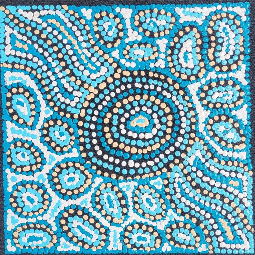 Michelle tient ses Rêves de son grand-père et par ses grands-mères. Elle peint souvent des oeuvres en lien avec “Minyma Inmaku” (Cérémonies des femmes) et des histoires associées la région de sa grand-mère autour de Tjukurla, Mimili et Patjar. Elle utilise régulièrement une palette qui tire vers les bleus et les ocres.