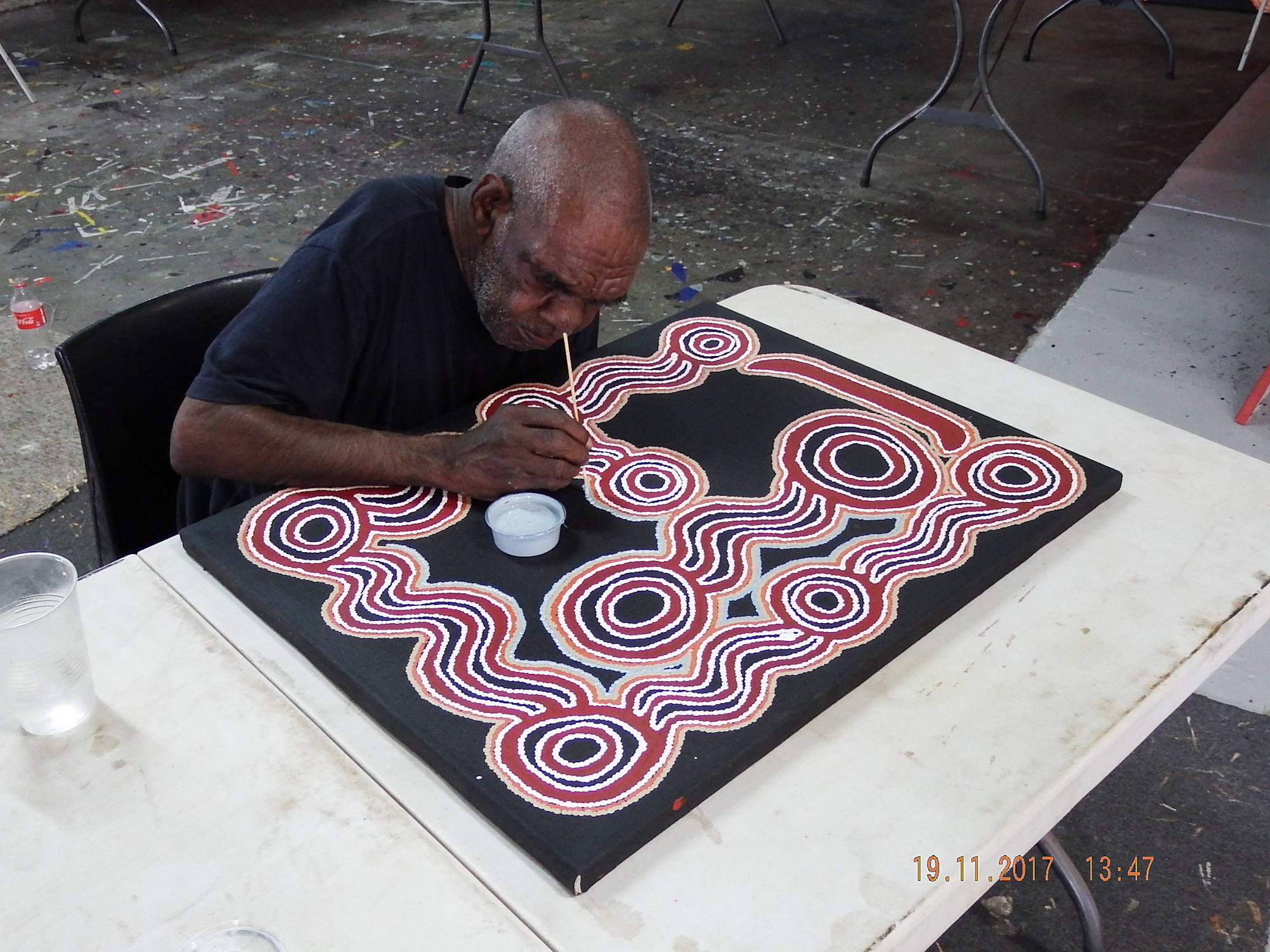 Son art reflète les “Dreamings” (rêves) du Corbeau et de l’Émeu, éléments centraux de la cosmologie Warlpiri. Il est également lié aux régions de Lake Wills et Lake White, qui constituent son “Pays” ancestral.