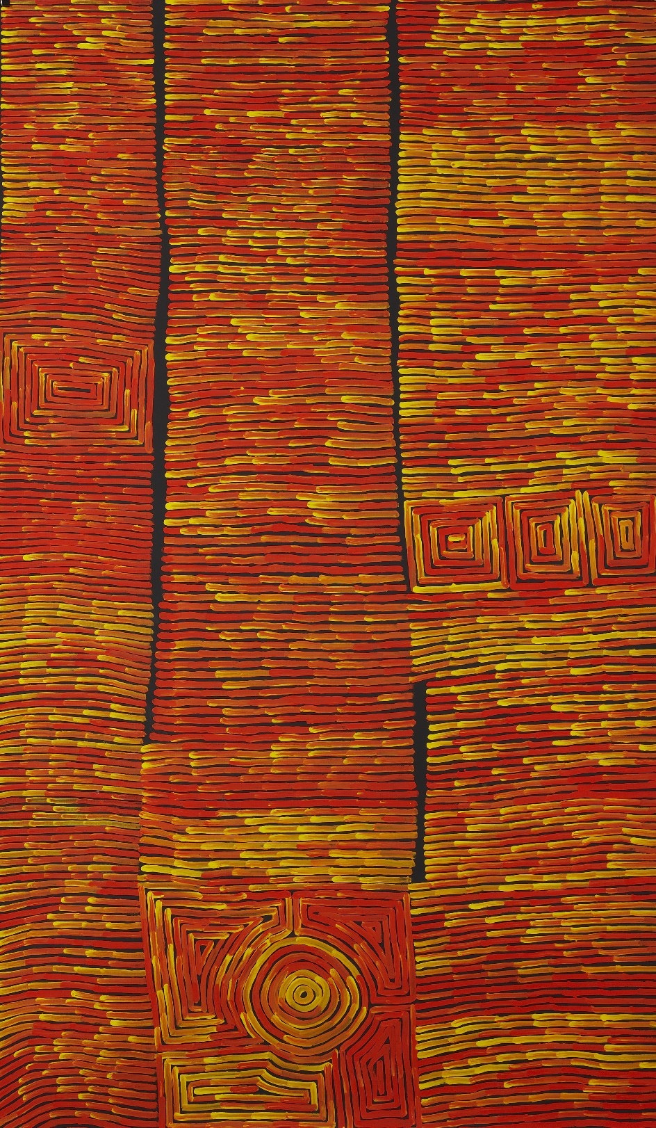 Ses œuvres, construites sur une géométrie rigoureuse et des teintes incandescentes, transmettent les grands récits du Dreaming liés au feu, à la pluie et à la création.