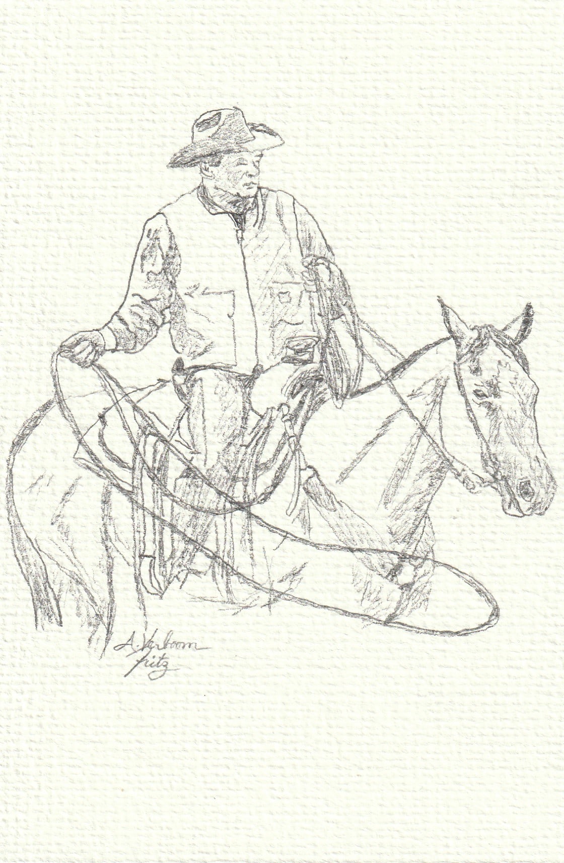 ‘Roper Studies’ are original pencil sketches by Alexandra Verboom Fritz featuring cowboys on horseback in various roping positions. These quick sketches are studies for possible future works.