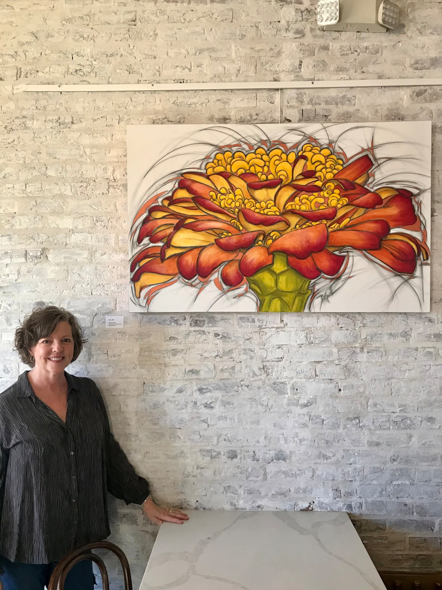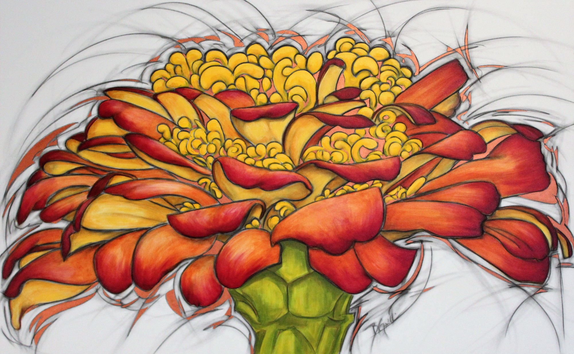 Single red-yellow Zinnia bloom with copper accents. Copper paint around edge of gallery wrapped canvas.