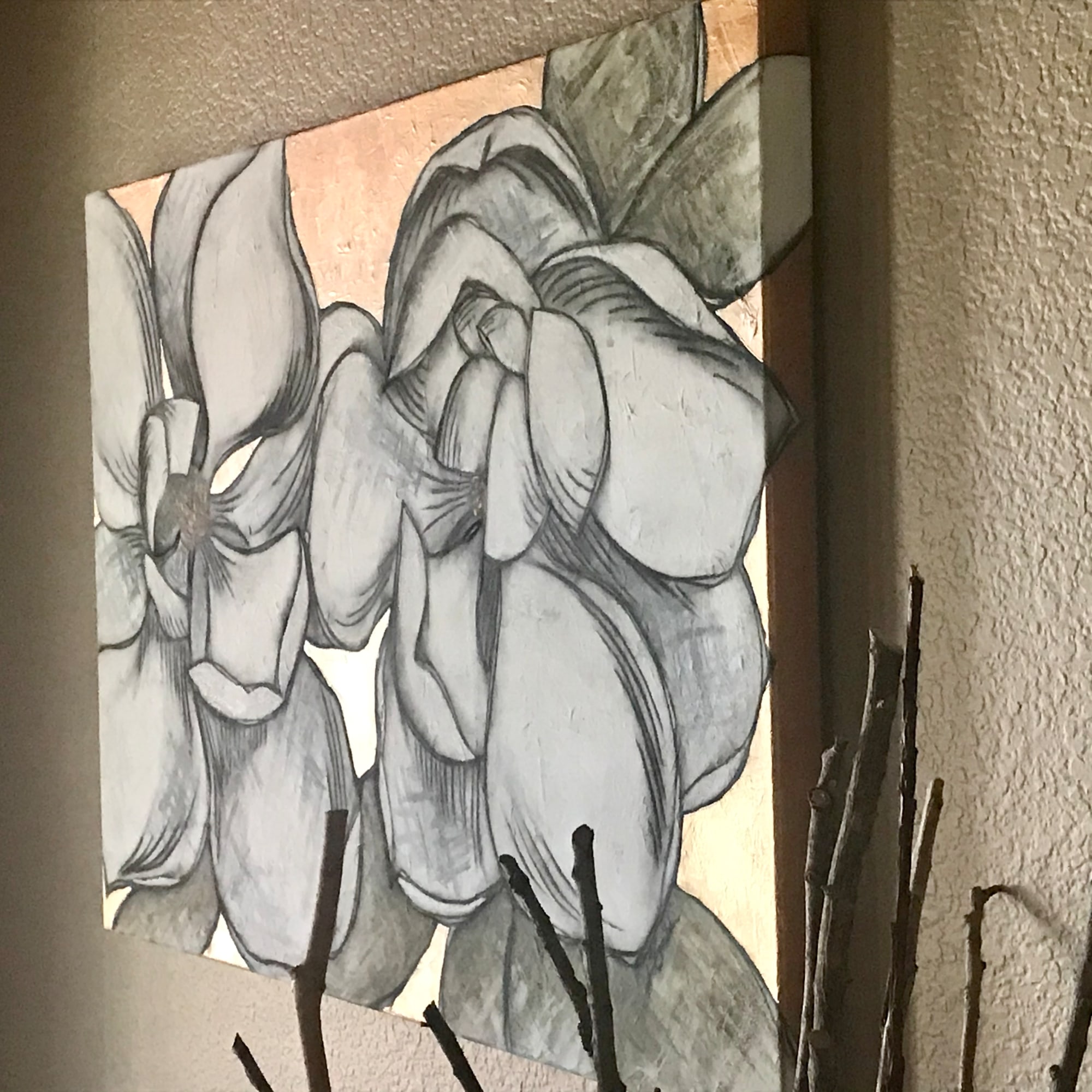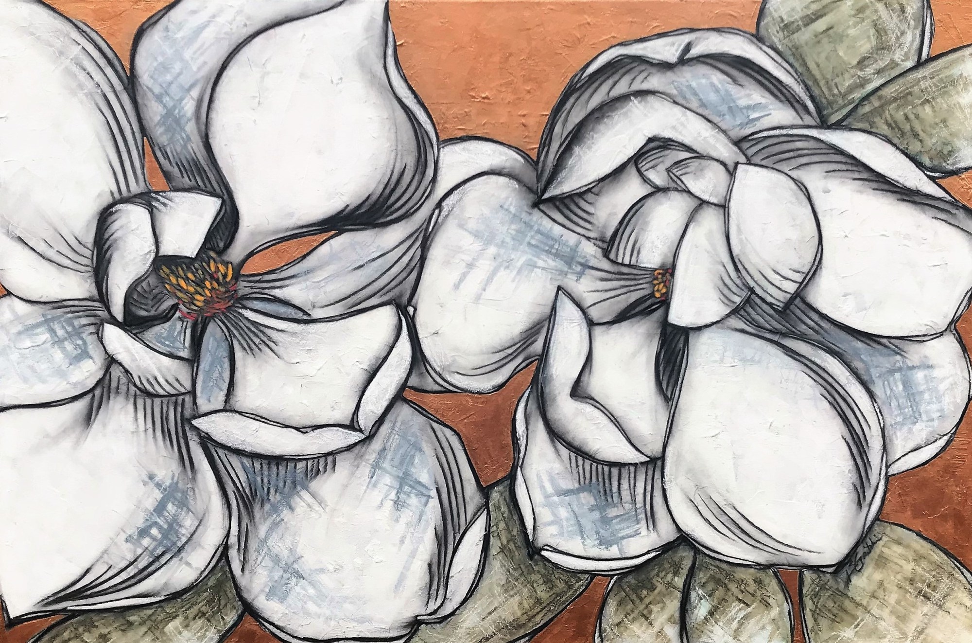 Charcoal/watercolor on gallery wrapped canvas. White magnolias with copper accent.
