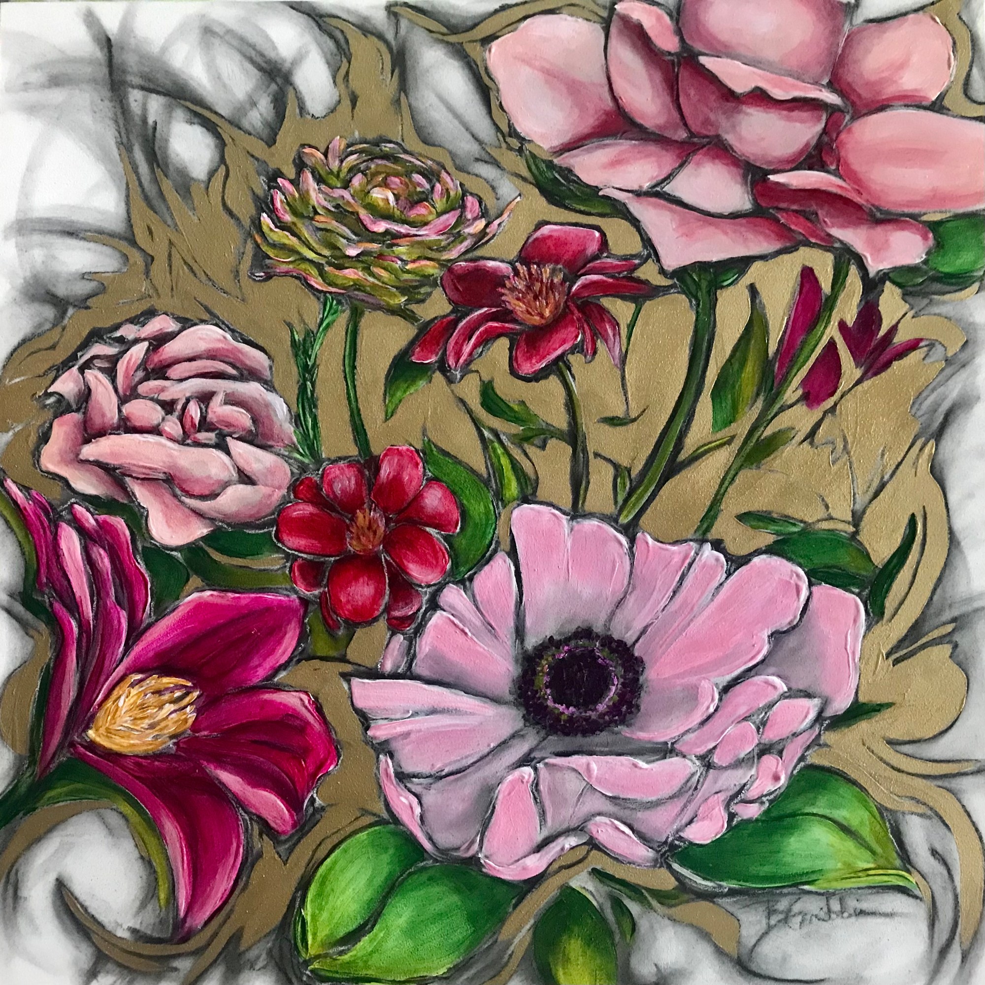 Pink Garden by Brenda Gribbin  Image: Vibrant pink blooms dance against a bronze background.