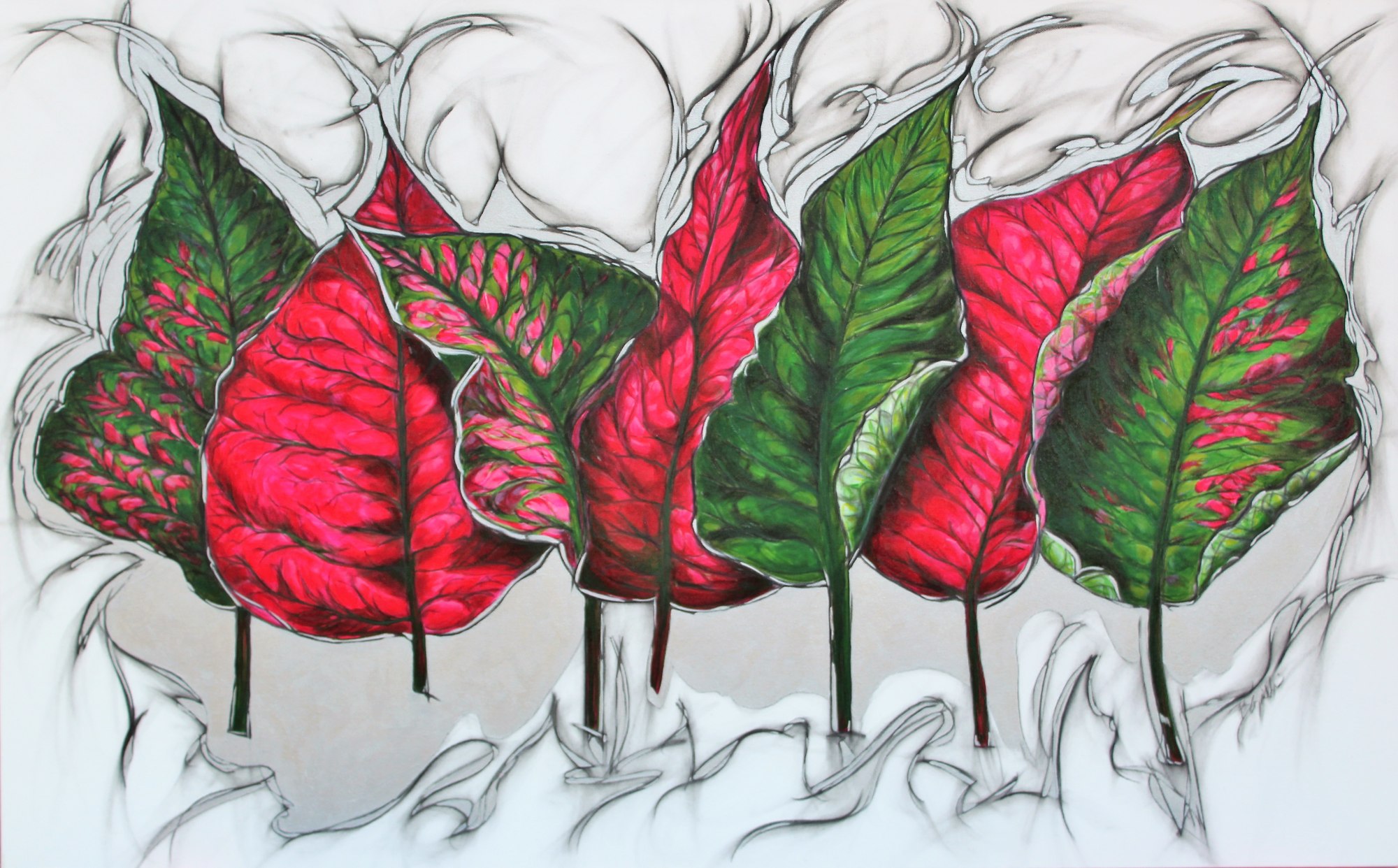 Red and green Poinsettia Petals parade across the canvas, with expressive charcoal markings and silver accents.