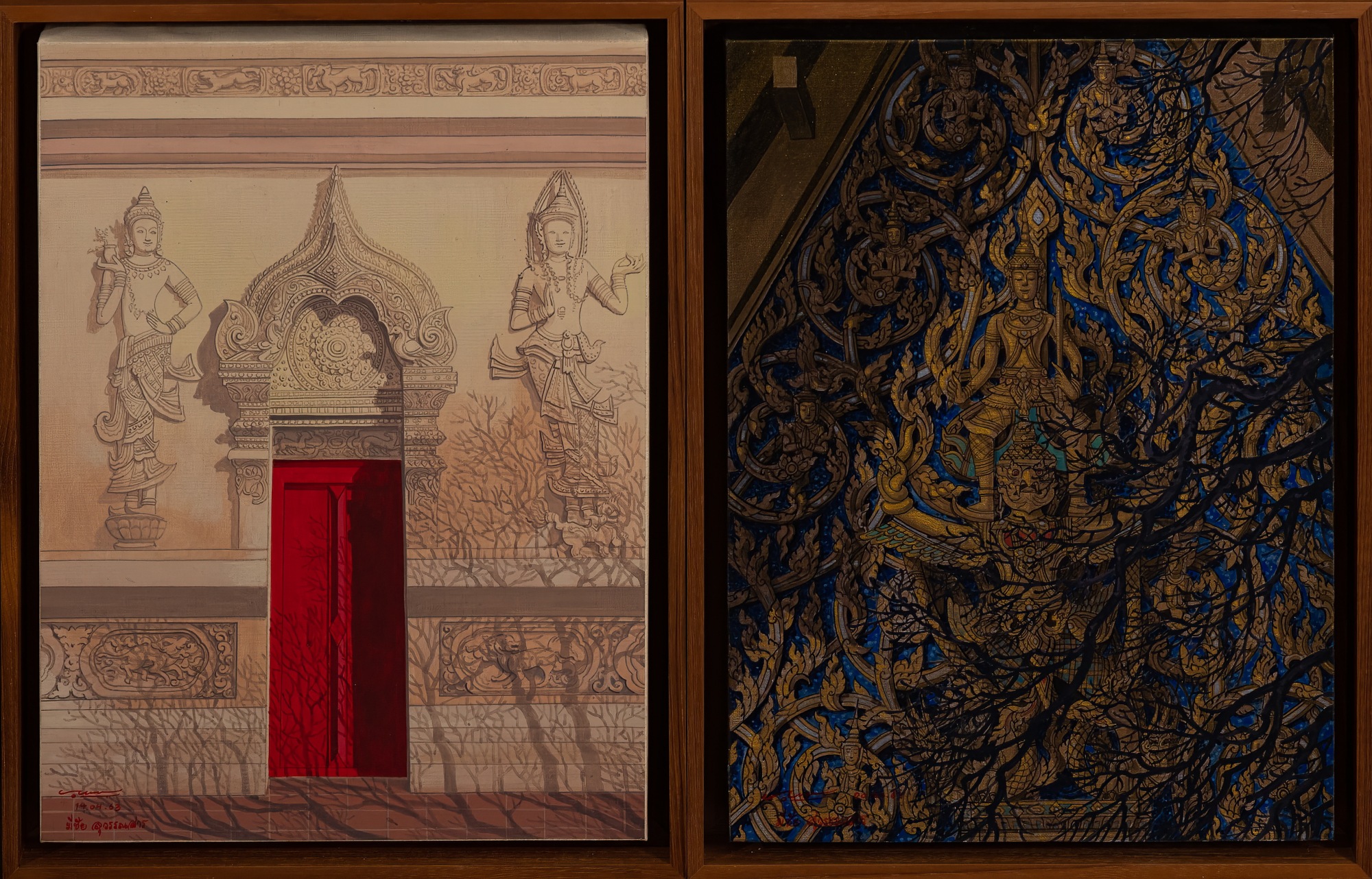 A painting depicting the entrance of Thailand's Wat Sing and the roof of the Temple of the Emerald Buddha encapsulates the essence of Thai spirituality and cultural heritage. The entrance of Wat Suthat represents a gateway to enlightenment and inner peace, while the ornate roof of the Temple of the Emerald Buddha symbolizes divine protection and spiritual guidance. Together, these architectural elements embody the profound connection between Thai people, their faith, and the timeless wisdom of Buddhism.