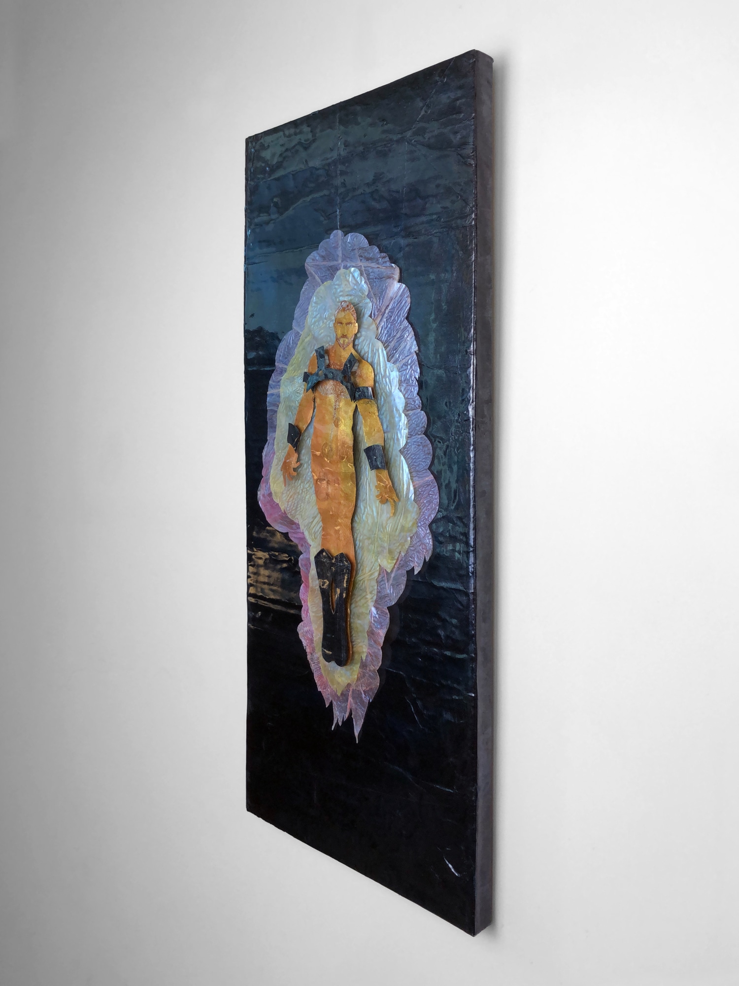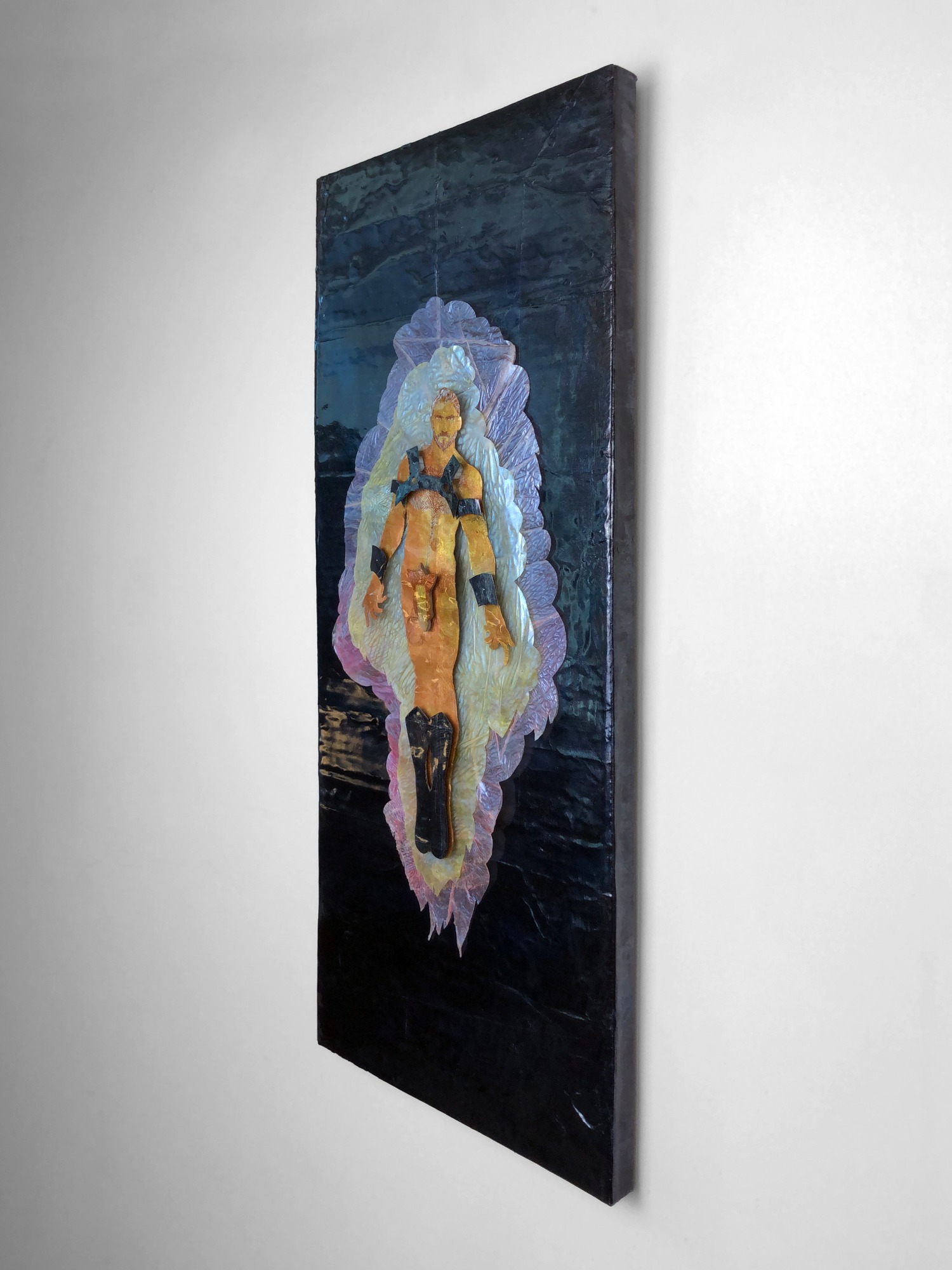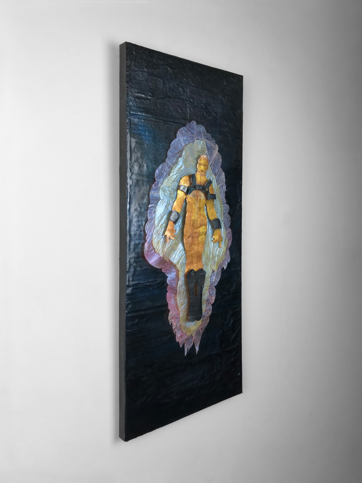 The piece draws on superhero comic books and my love of reclaimed materials to humorously reframe my experience growing up in the closet. The penis is detachable and reattachable.