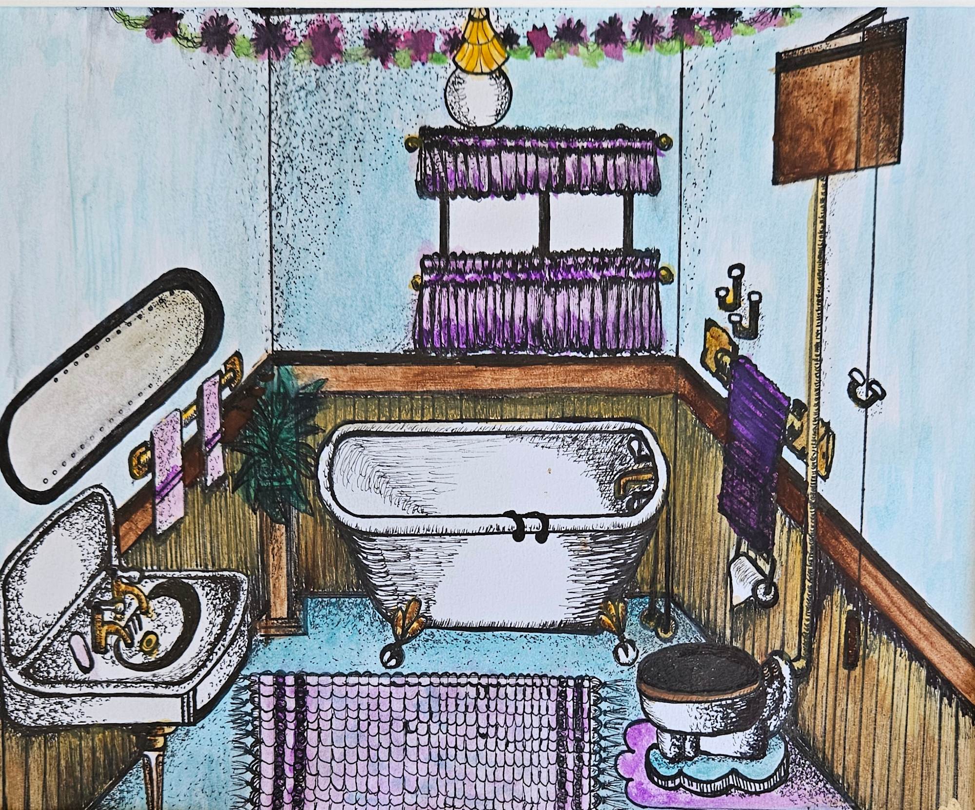 Inspired by a cherished memory of a family bathroom on a farm, this artwork blends personal history with meticulously researched details, including insights gained from a visit to the Kohler Bathrooms Museum in Wisconsin. The result is a rich, nostalgic tableau that invites viewers to step back in time and experience the simple yet elegant charm of a bygone era.