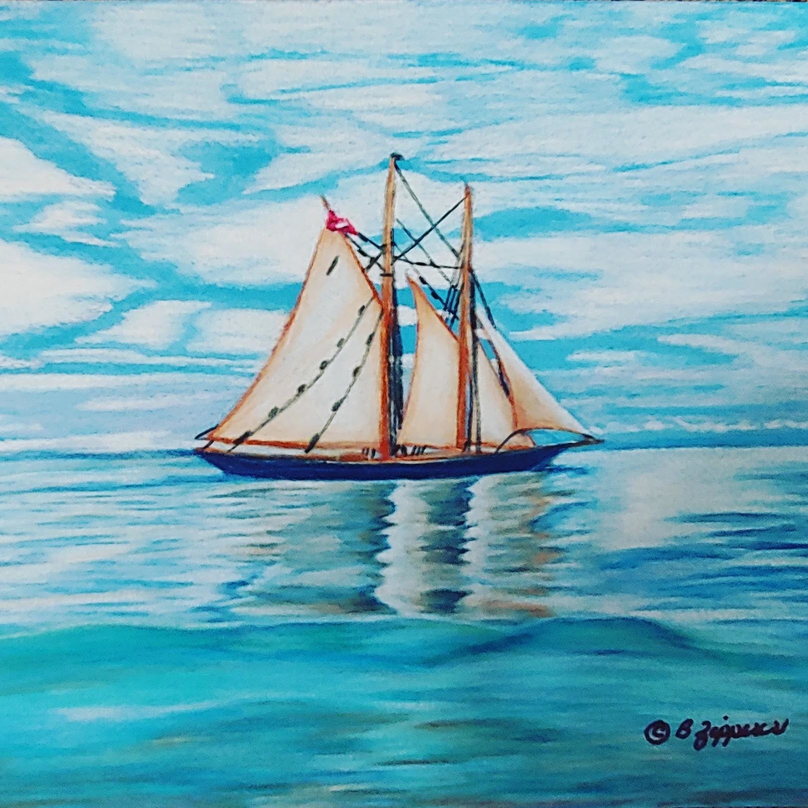 This piece is one of 5 tall ships that were racing from Sturgeon Bay to Chicago on Lake Michigan, July 2019. A local professional photographer, Patti Raine was able to get out on the lake to take photo's of the ships. She was kind enough to let me use them as a reference to render my colored pencil pieces.