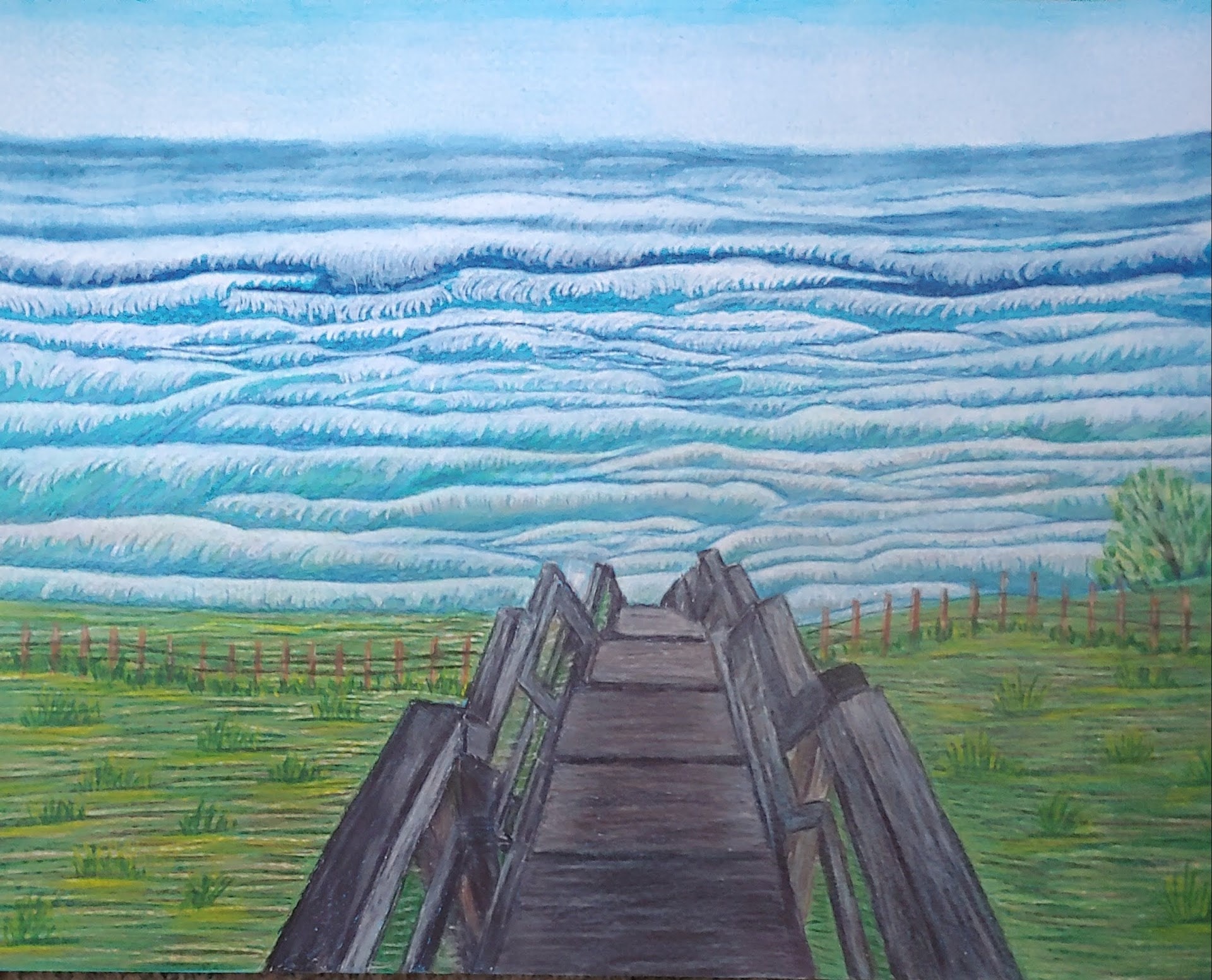 The depiction of ocean waves is a standout feature, showcasing subtle detailing in various shades of blue that evoke a sense of depth and movement. The tranquil ocean is matched by a clear sky above, further enhancing the peaceful and inviting atmosphere of the piece. The overall composition draws viewers in, as if inviting them to step down the boardwalk and immerse themselves in the serene coastal landscape.