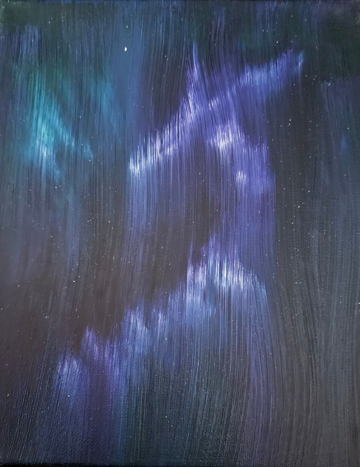 Northern Lights Dragon is an enchanting 8x10-inch oil painting on stretched canvas that beautifully captures the mystique of the Northern Lights. This mesmerizing abstract artwork unfolds against a backdrop of deep, dark hues, with a smooth gradient of purples and blues setting the stage. Diagonal streaks of iridescent light sweep across the canvas, evoking the ethereal movement of the auroras, and hinting at a cosmic phenomenon that feels both otherworldly and magical.
