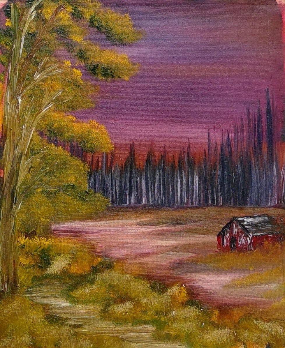 "Evening at Sunset" is an 8x10 oil painting on stretched canvas that exudes a warm and vibrant atmosphere. This captivating landscape depicts a rural scene bathed in the gentle glow of the setting sun. A winding path stretches through the foreground, inviting the viewer's gaze towards a distant, rustic red barn. The path is flanked by tall, slender trees with dark trunks and lush foliage that contrasts beautifully against the vivid hues of the sky.