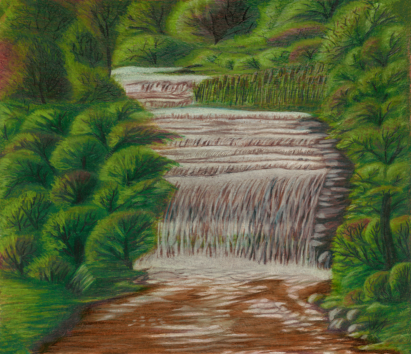 "Fonferek Glen Waterfalls" is a stunning and vivid depiction of a serene natural landscape. This captivating 9 x 12 piece, created with colored pencils, showcases the beauty of Fonferek Glen Park in Brown County, Wisconsin. The artwork vividly portrays lush greenery surrounding cascading waterfalls. Dense bushes and trees fill the scene, enveloping the viewer in a tranquil forest setting.