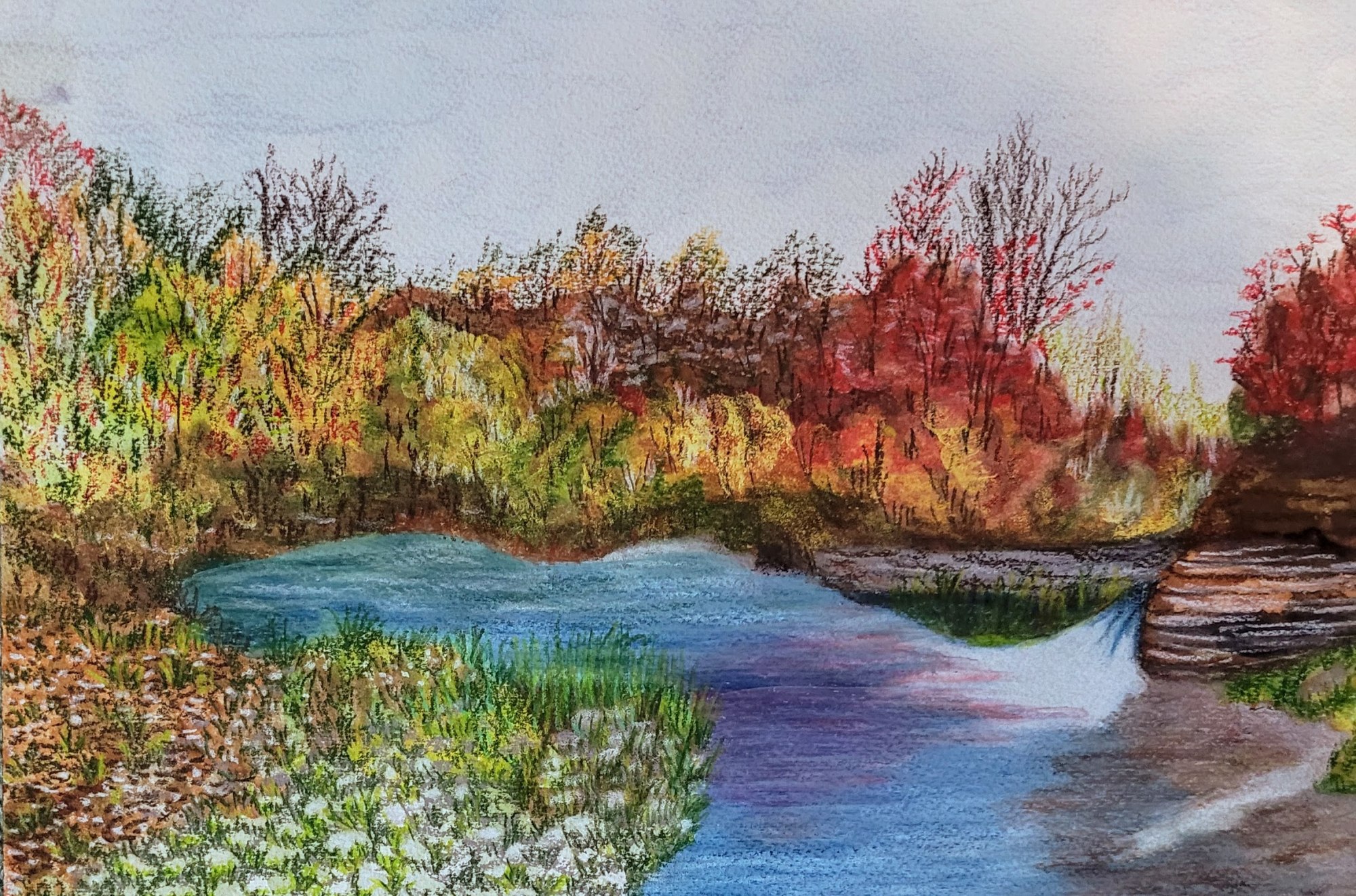 "Hidden Refreshment" is a captivating work of art measuring 9 x 12 inches, created using watercolors and colored pencils. This serene landscape painting portrays a tranquil river winding through a vibrant autumn forest. The surrounding trees are rendered in rich and warm hues of red, orange, yellow, and green, capturing the peak of the fall season.