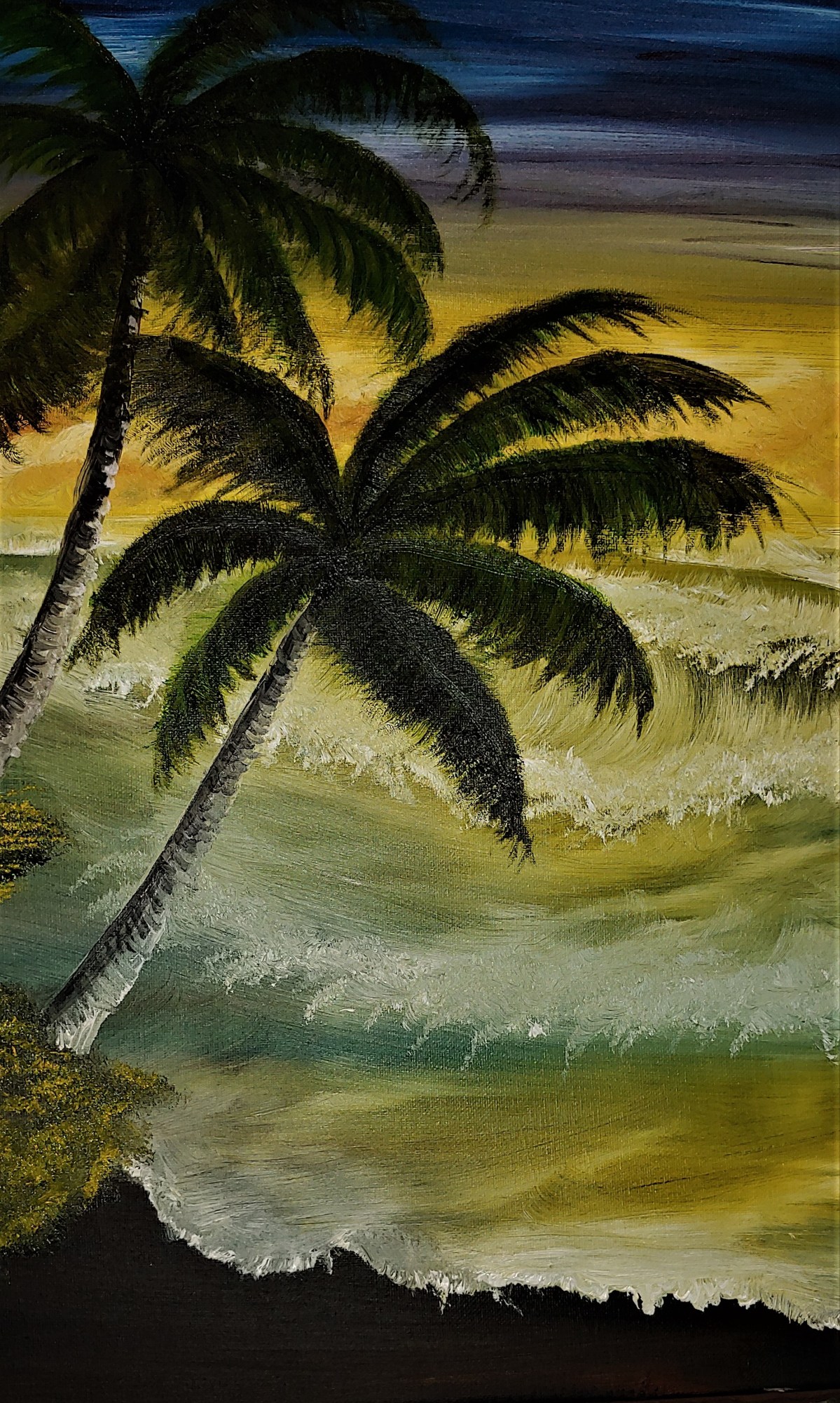"High Tide" is an 8x10 oil painting on stretched canvas that captures the vibrant and serene beauty of a tropical beach scene. The composition is anchored by two tall, slightly curved palm trees in the foreground, their lush green fronds reaching outward as if to embrace the viewer. These trees are situated on a small patch of land on the left side of the painting, adding a sense of grounding to the scene.