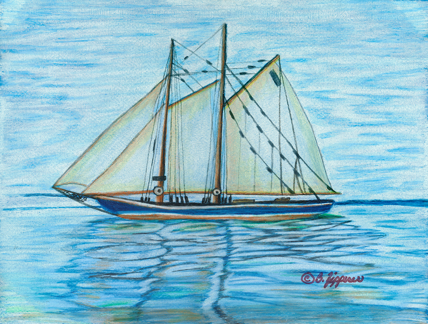 The Inland Seas Education Association (ISEA) was created in 1989, to enhance public understanding and stewardship of the Great Lakes through experiential shipboard and onshore educational programs for children and adults.ISEA’s award-winning educational programs are designed for students in grades 5 – 12 and are modified for learners of all ages. More than 75,000 participants have experienced the Great Lakes Schoolship Program, including students from over 140 Michigan communities. Summer shipboard experiences for all ages include astronomy, history, and science programs on Grand Traverse Bay and Lake Michigan. This information was copied from: https://www.tallshipsamerica.org/ This piece is one of 5 tall ships that were racing from Sturgeon Bay to Chicago on Lake Michigan, July 2019. A local professional photographer, Patti Raine was able to get out on the lake to take photo's of the ships. She was kind enough to let me use them as a reference to render my colored pencil pieces. This artwork is part of a five tall ship collection that was made for the "Tall Ship Exhibit October/November 2019, " at Steele Street Gallery, Algoma, Wisconsin.