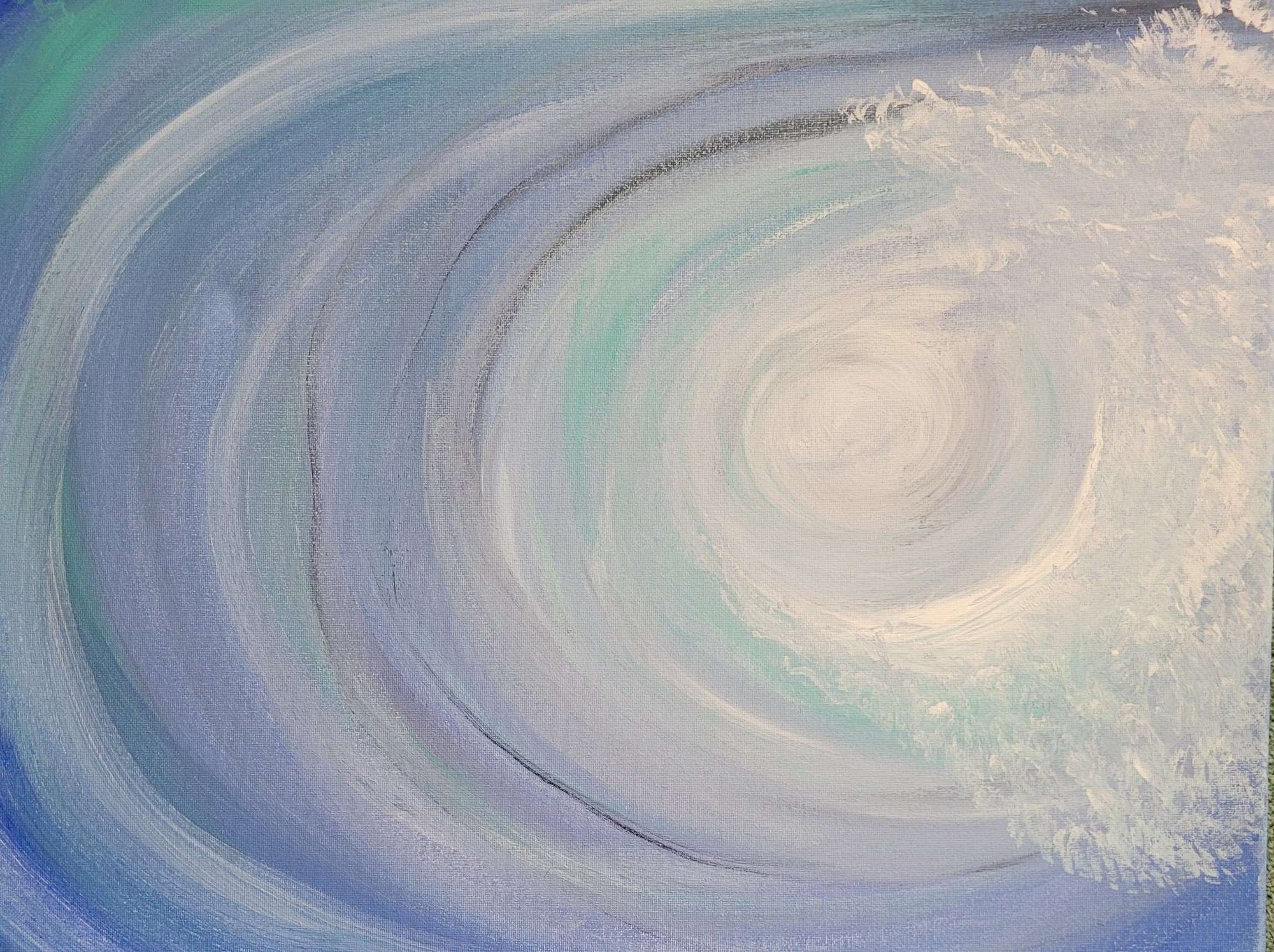 "Lake Michigan Surf" is a captivating abstract painting that draws inspiration from the mesmerizing waves of Lake Michigan. Measuring 16 x 20 inches, this piece is created with acrylics and showcases an intricate swirling vortex. At the heart of the vortex lies a radiant white center, which gradually transitions into soft shades of light blue, turquoise, and eventually deep, darker blue hues as it spirals outward.