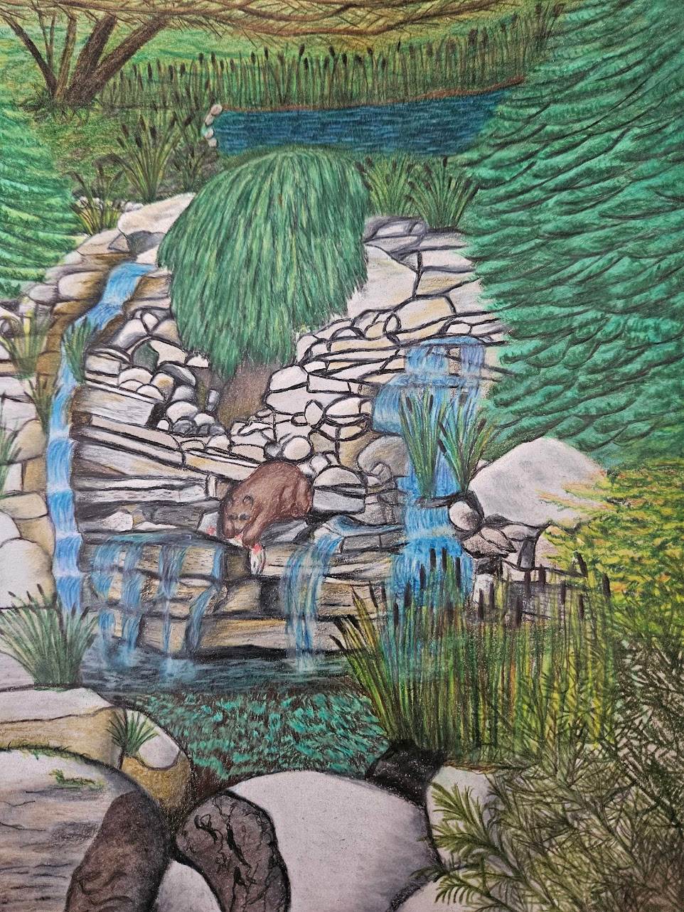 In "Nature's Embrace," the artist skillfully depicts a serene landscape that harmonizes the gentle flow of water with vibrant greenery. A brown bear, poised on a rocky ledge, introduces a dynamic element to this tranquil scene, embodying the spirit of the wild. The intricate details of the foliage and cascading streams create a rich sense of depth, drawing the viewer into a moment of quiet reflection. This piece not only showcases the beauty of nature but also serves as a reminder of the delicate balance within our ecosystems. It invites contemplation and appreciation, making it a perfect addition to any space that seeks to celebrate the wonders of the natural world.