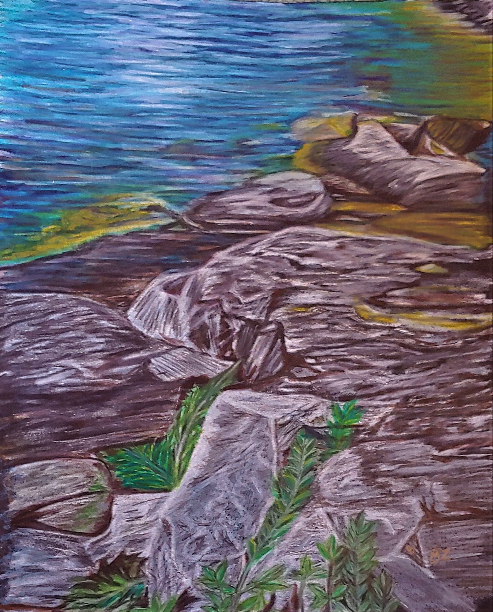 In the foreground, jagged, textured rocks are interwoven with patches of green plants, bringing a tactile quality to the piece. The background seamlessly transitions into a calm water body, painted in a harmonious blend of blue and green hues that suggest clear and reflective waters.