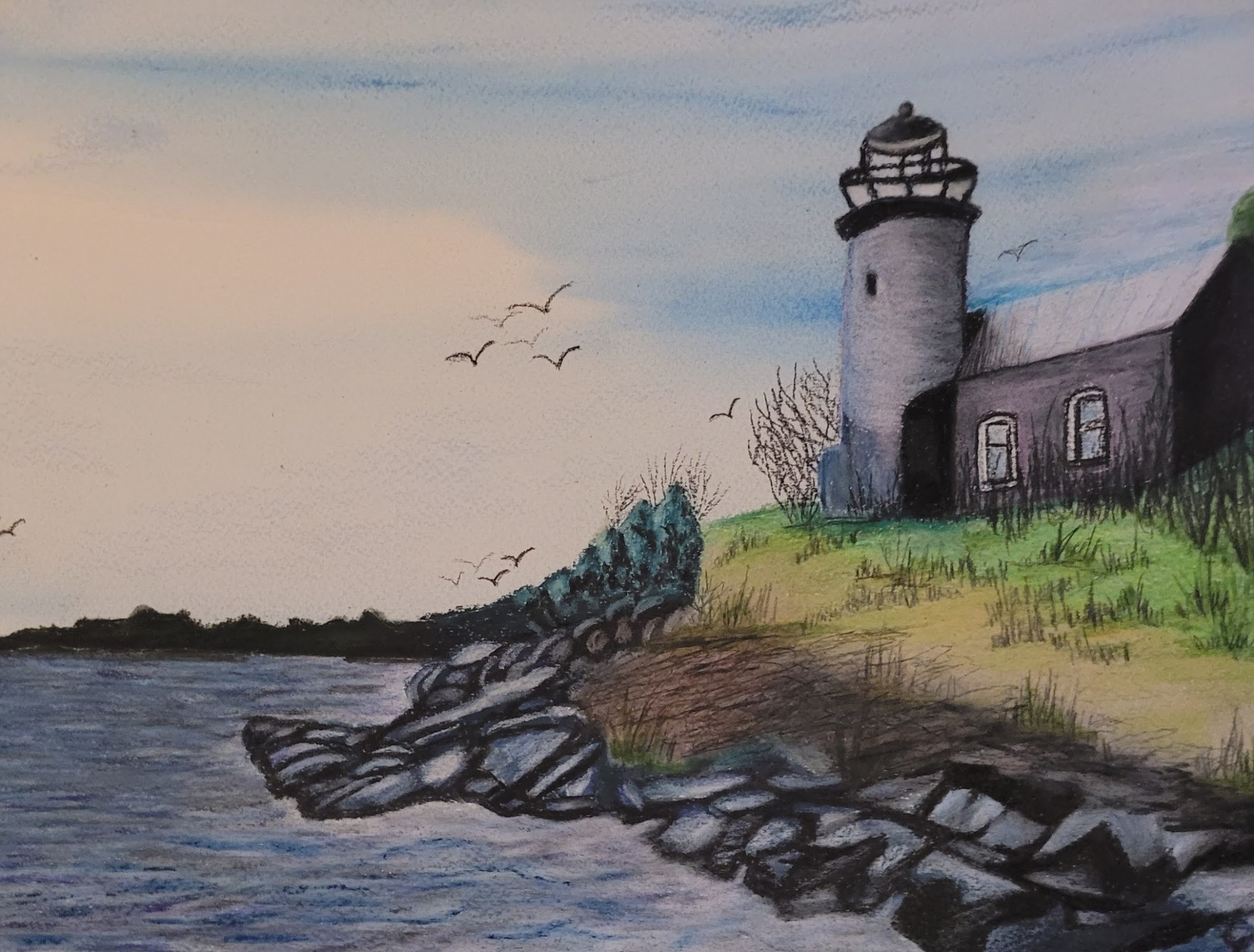 "Protecting the Shore" is a captivating 9x12 watercolor and colored pencil artwork on Arches Cold Press Paper that masterfully captures the serene beauty of a coastal landscape. The centerpiece of this charming scene is a lighthouse, situated on the rocky shore to the right side of the composition. Tall and cylindrical, the lighthouse's dark, weathered appearance speaks to its enduring presence even though its light was extinguished decades ago. Adjacent to this stoic structure is a building with a sloped roof, painted in similar dark tones to create a harmonious balance.