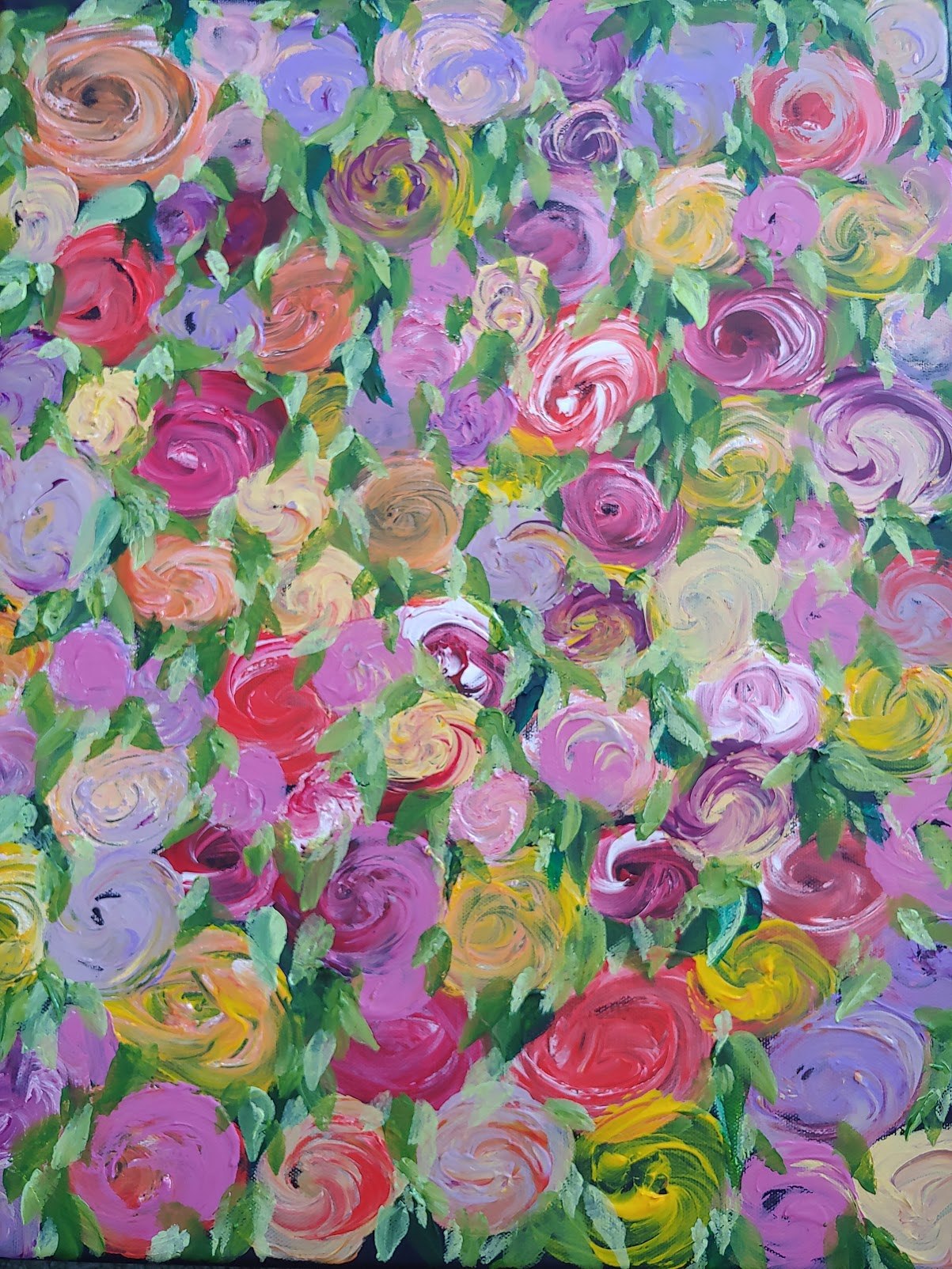 Titled "Roses, Roses," this captivating piece is a vibrant celebration of color and movement, executed in acrylic on canvas. The artwork features an arresting array of stylized roses rendered in an explosion of colors. Shades of pink, red, yellow, purple, and green swirl together in dynamic brushstrokes, each bloom seemingly brimming with life and energy. The artist’s technique gives a sense of constant motion, making the flowers appear as if they're swaying gently in a garden breeze.