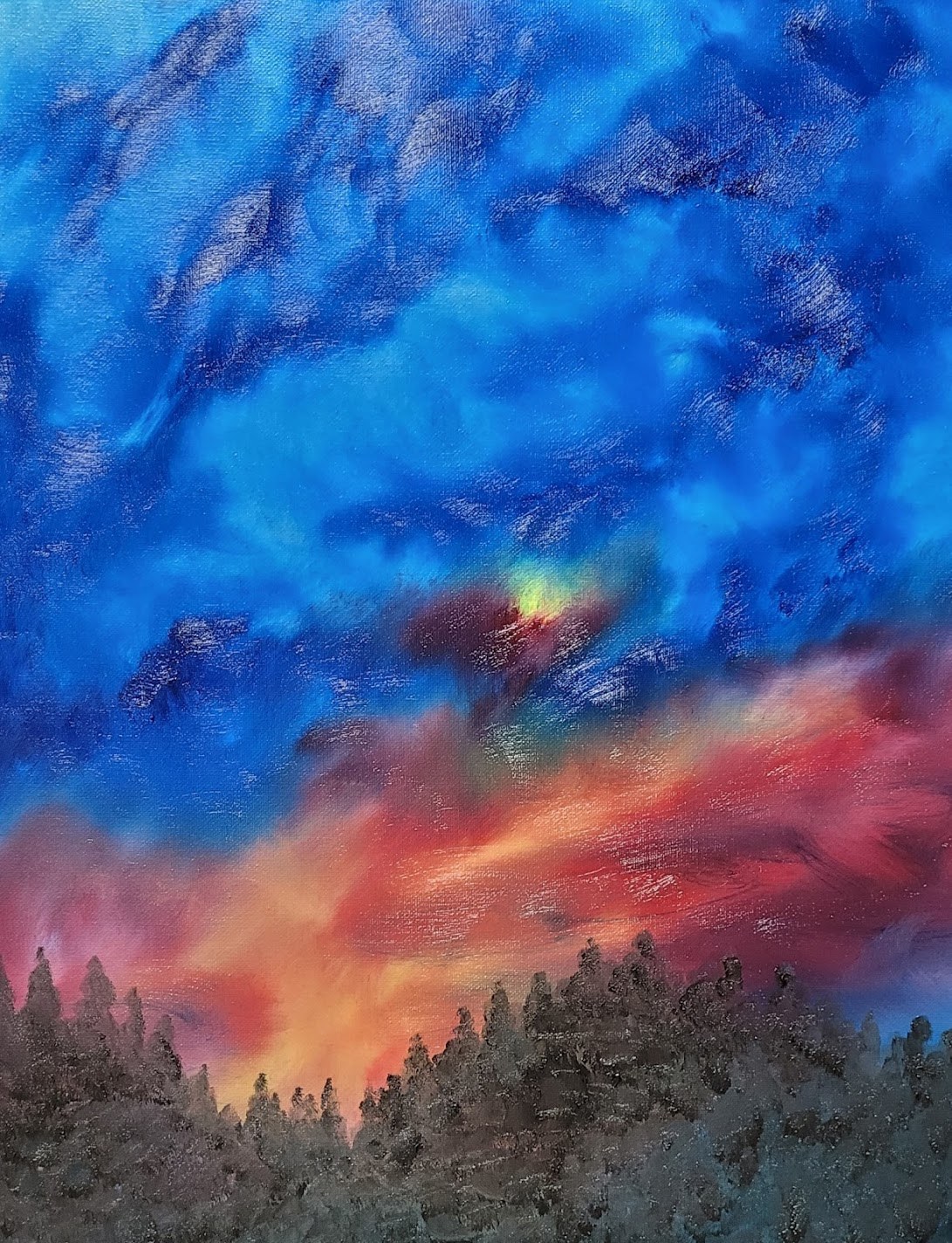 Adding an element of contrast and grounding the vivid sky above, a row of trees is depicted in dark, muted tones. These silhouettes are thoughtfully rendered to anchor the composition, providing balance to the dramatic display of colors overhead. The artist’s use of bold, expressive brushstrokes paired with smooth blending techniques beautifully captures the dynamic and ever-changing nature of the sky.