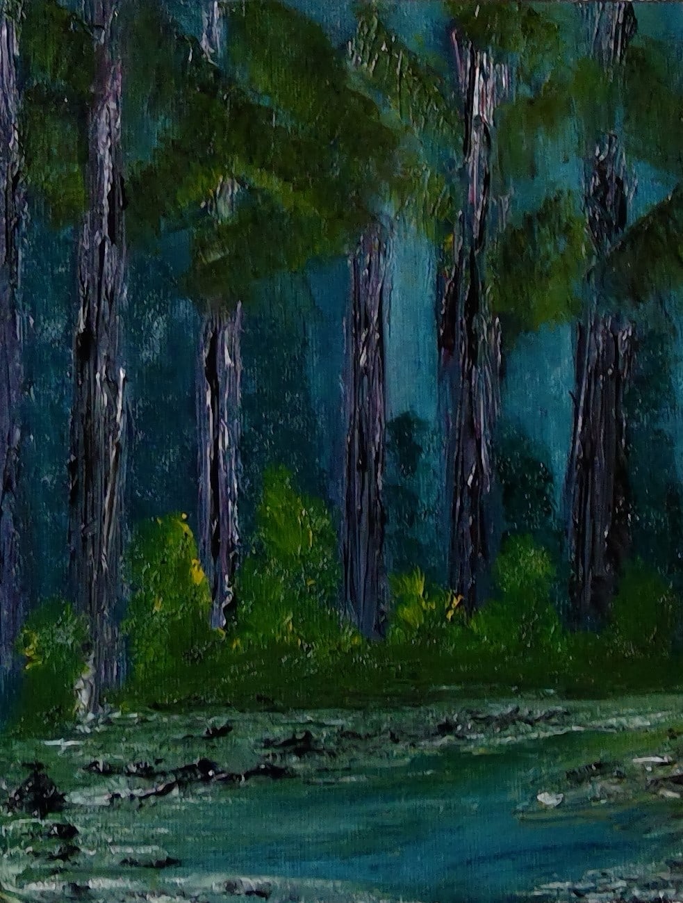 Discover a hidden world within "Secluded Forest." This tranquil piece invites you to wander through tall, inviting trees, their deep greens contrasting beautifully with the calming blues of the background. The interplay of light and shadow creates a serene atmosphere, perfect for those quiet moments of reflection.
