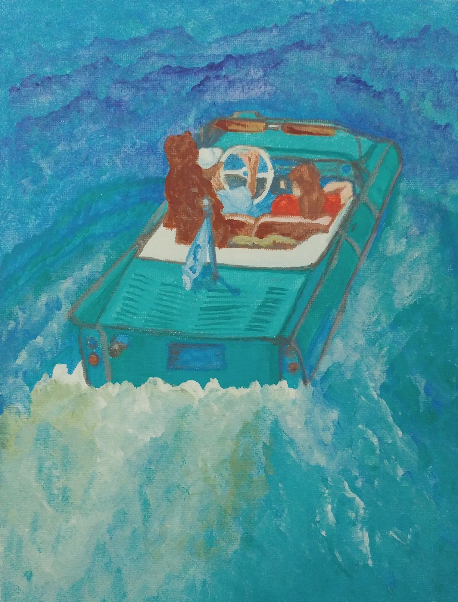 I was out painting with a group called WEA in Sturgeon Bay WI. I decided that I'd paint on the bridge to get a view of things from a different angle than everyone else. Then I saw this car/boat come right out from underneath the bridge, I hadto capture that! How unique!! It sure looked like fun. The dog that was sitting on the back really seemed to enjoy it.