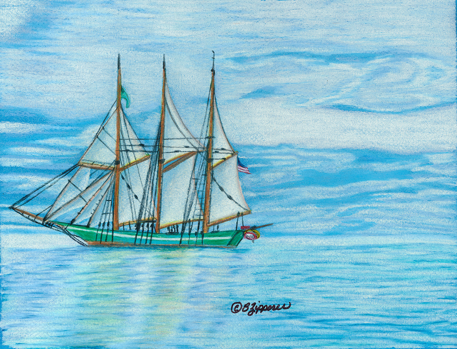 The S/V Denis Sullivan, owned and operated by Discovery World Ltd., was completed by over 900 volunteers and launched in 2000. This replica of a Great Lakes freight schooner, and Flagship of Wisconsin, operates as a floating classroom and goodwill ambassador for the state. From her homeport of Milwaukee on Lake Michigan, the schooner offers educational sails, public day sail and private charters for people of all ages from May through September and is committed to re-establishing the historical, cultural, and environmental bonds between the community and one of its most valuable resources, the Great Lakes. The educational programs available are a 90 minute Dockside Discovery, two to three hour Lake Watch Expeditions and two to fourteen day Science Under Sail. She also offers a “Bucket List Sail,” a multiple day voyage throughout the Great Lakes for the adventure-seeking adult. Copied from https://www.tallshipsamerica.org/vessels/denis-sullivan/ This piece is one of 5 tall ships that were racing from Sturgeon Bay to Chicago on Lake Michigan, July 2019. A local professional photographer, Patti Raine was able to get out on the lake to take photo's of the ships. She was kind enough to let me use them as a reference to render my colored pencil pieces. This artwork is part of a five tall ship collection that was made for the "Tall Ship Exhibit October/November 2019, " at Steele Street Gallery, Algoma, Wisconsin.