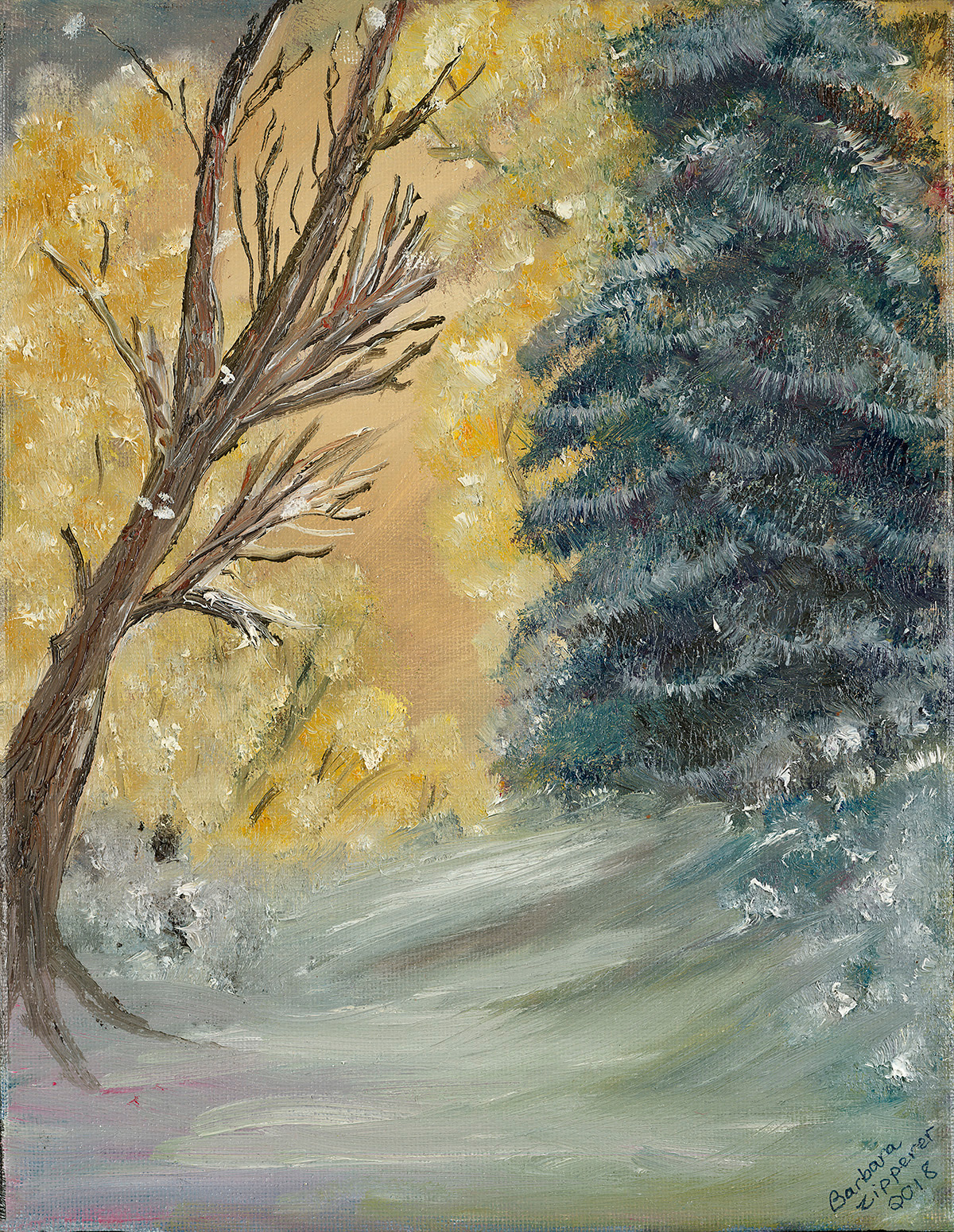 In contrast, the right side of the canvas is dominated by a dense, green evergreen tree, its branches gracefully dusted with a light layer of snow. The ground beneath these trees offers a subtle blend of pale green and soft white, suggesting either a fresh layer of frost or a thin blanket of snow. These elements together create a peaceful scene that beautifully encapsulates the quiet transition between seasons.