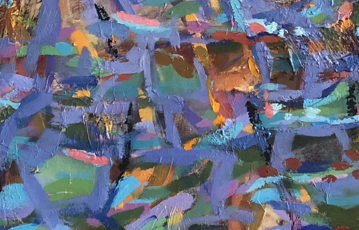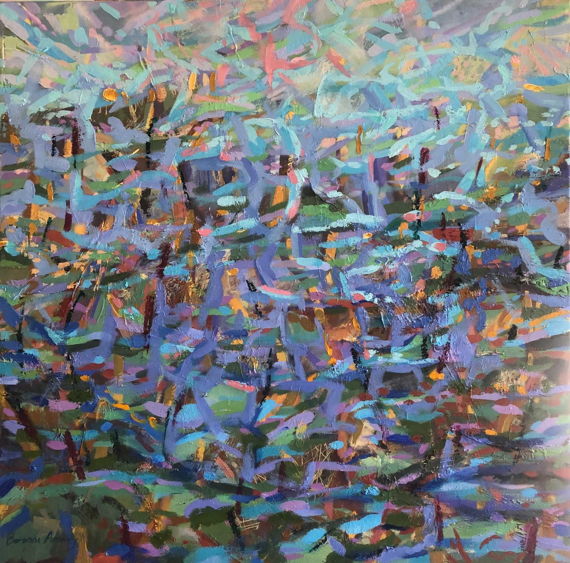 Thick layers of oil paint. Strong colours are intensified by being placed together - there are many many layers the effect implies that the subject is what is beneath the water's surface.