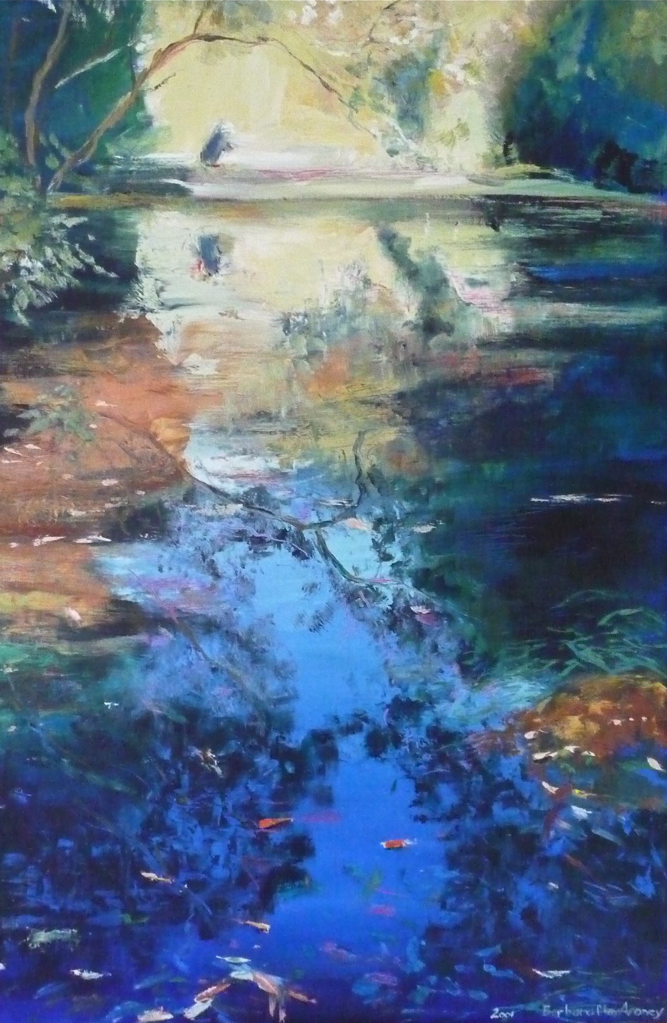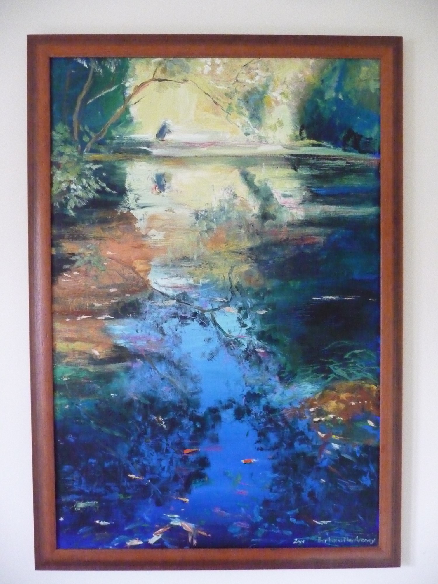 Layers of oil paint suggest the creek and surrounds, the figure of Neville in the background.