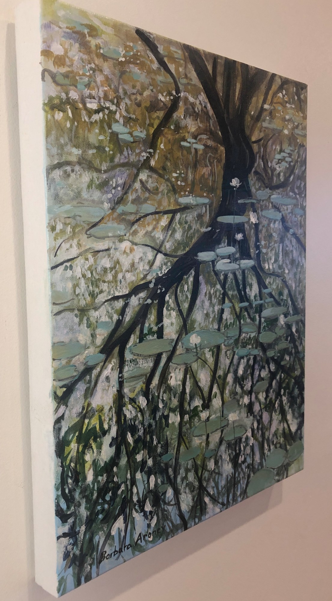 Thin washes and brushed marks. Lilies in a pond or billabong are a beautiful and tranquil sight. These are native in their natural setting unlike the ones painted by Claude Monet of his garden pond.