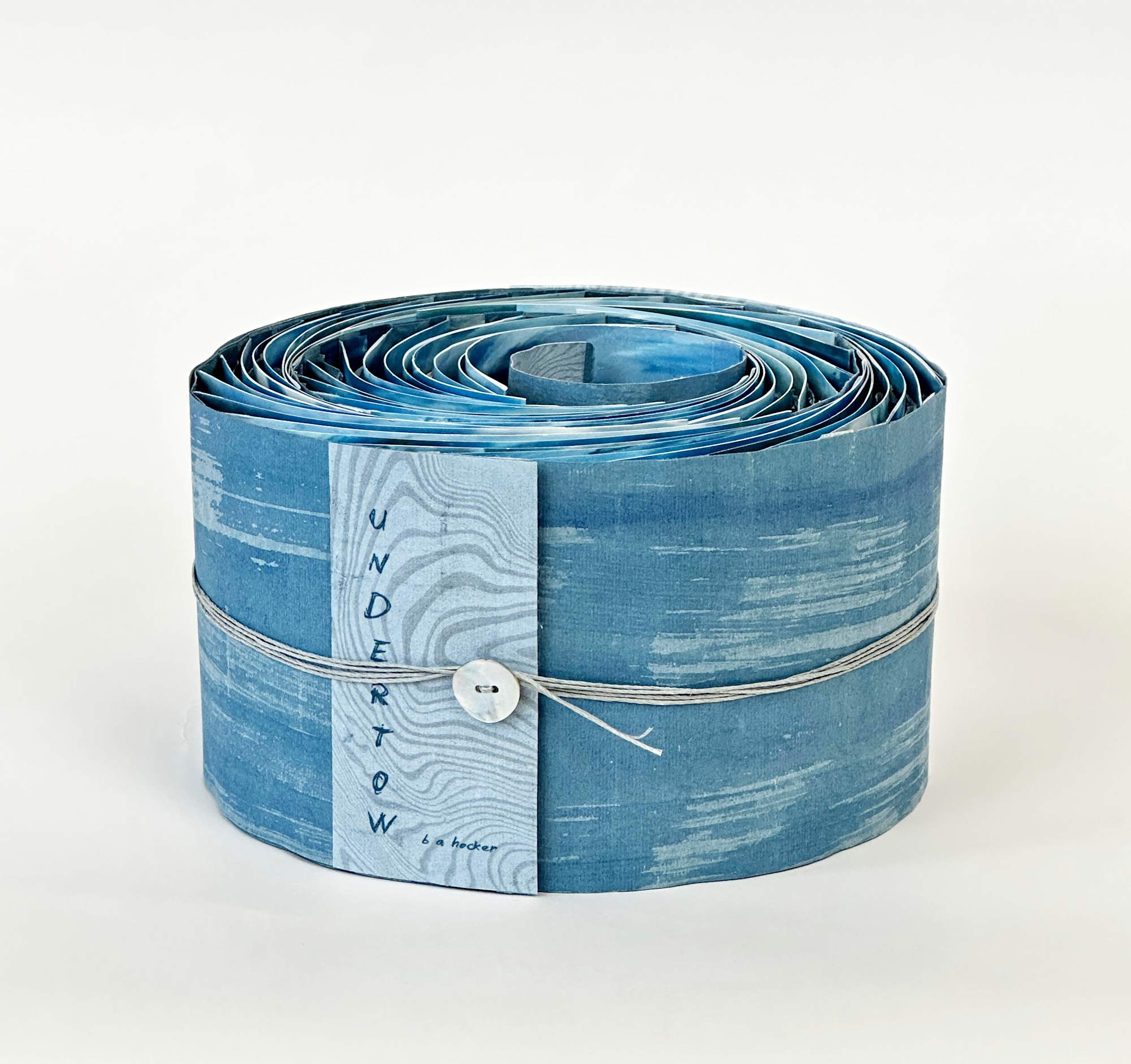 This piece is inspired by a humorous memory from my childhood and connects me to father, who passes away when I was 12. It features photographs of Long Island Sound juxtaposed with darker photos of the sea treated with a Japanese paper technique called Momogami which shrinks and crumples the paper. The momogami pages hide like the currents in an undertow. Dragonscale Binding.