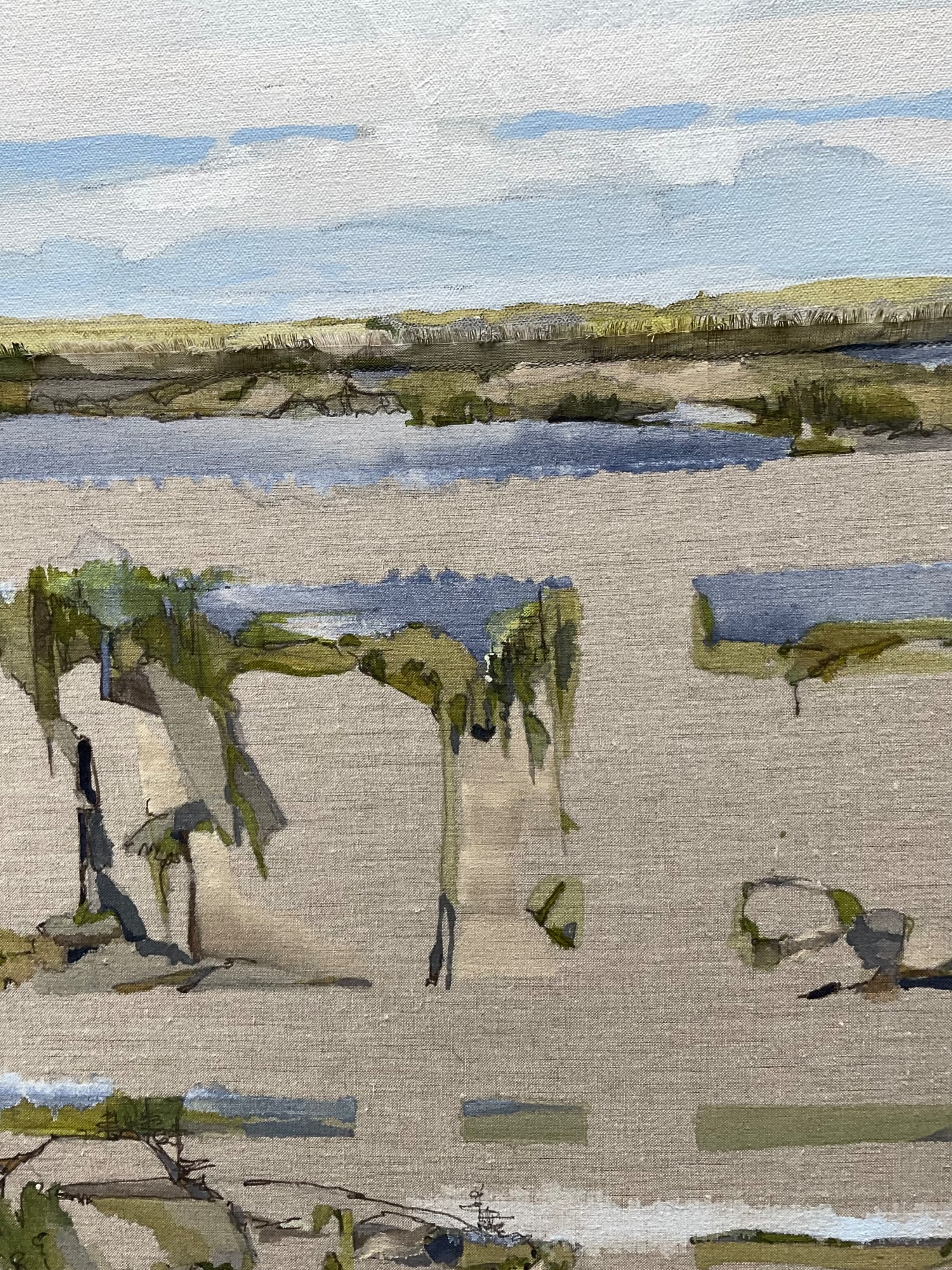 Belgian linen is seamed to cotton canvas to determine the horizon line where sky meets treeline or sky meets sea.
