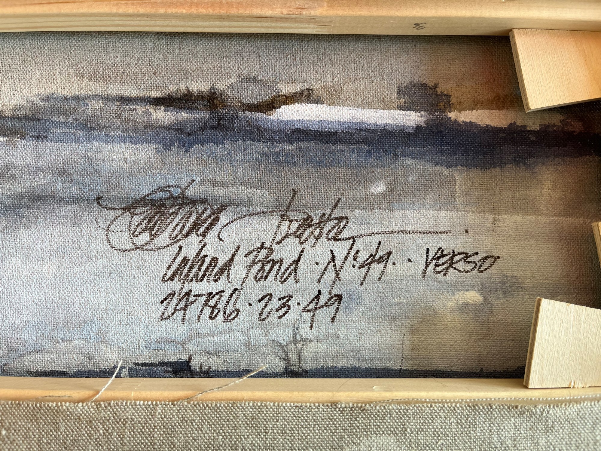 ‘Verso’ paintings are acrylic, archival inks + graphite on raw Belgian linen. An innovative technique, Houston stretches the linen that engages the warp and weft, then the idea of the inland pond is sketched and painted in reverse – giving the material and pigment agency. Once the reverse layers are carefully established, the linen is removed from its stretcher bars, turned over and re-stretched in the intended orientation. A second painting is done on the front of the linen enhancing the layers and pigments that were initially pressed through. The outcome is an ethereal, dreamlike haze that engage the viewer to hold their own memories and narratives of familiar landscapes.