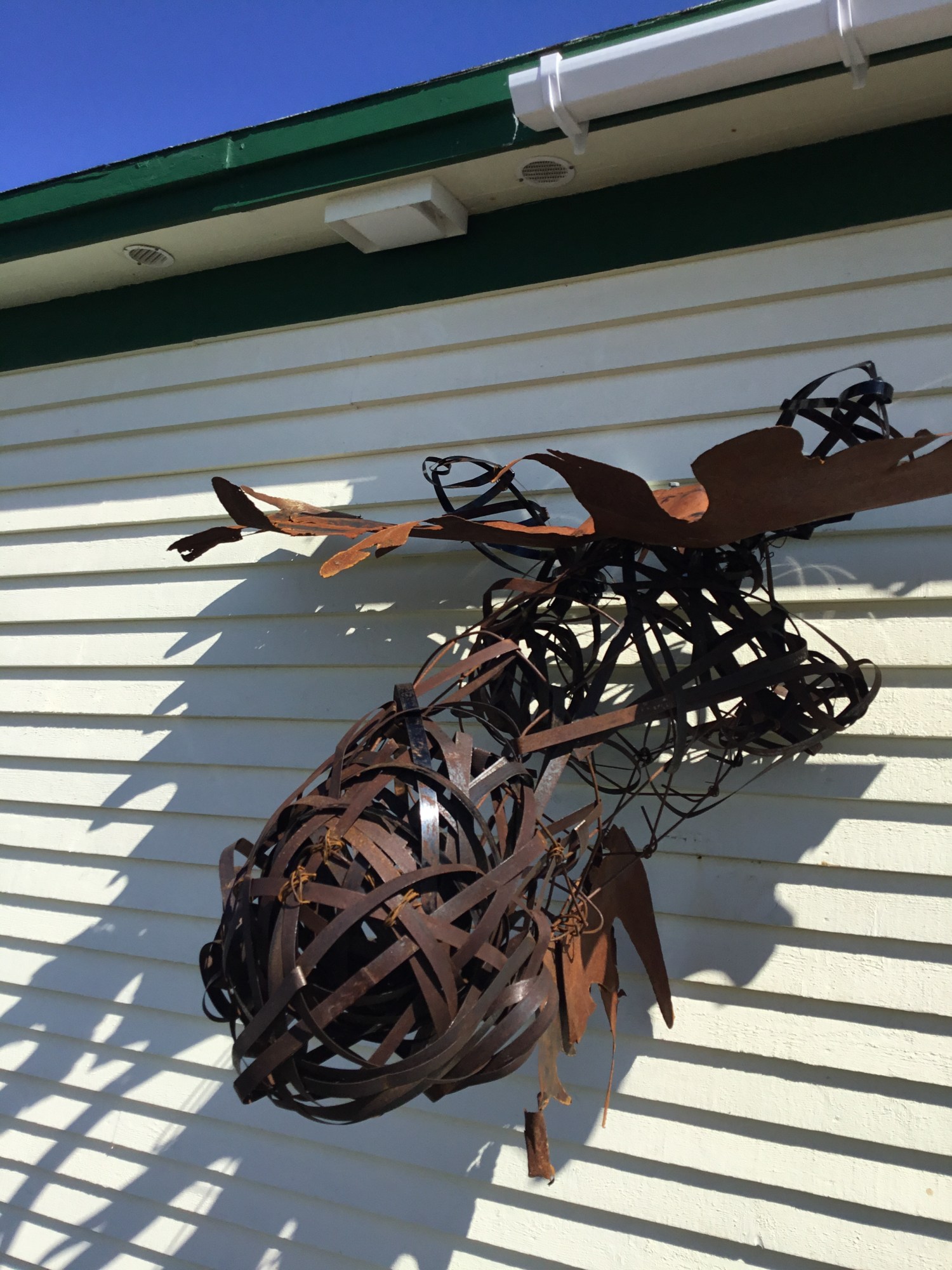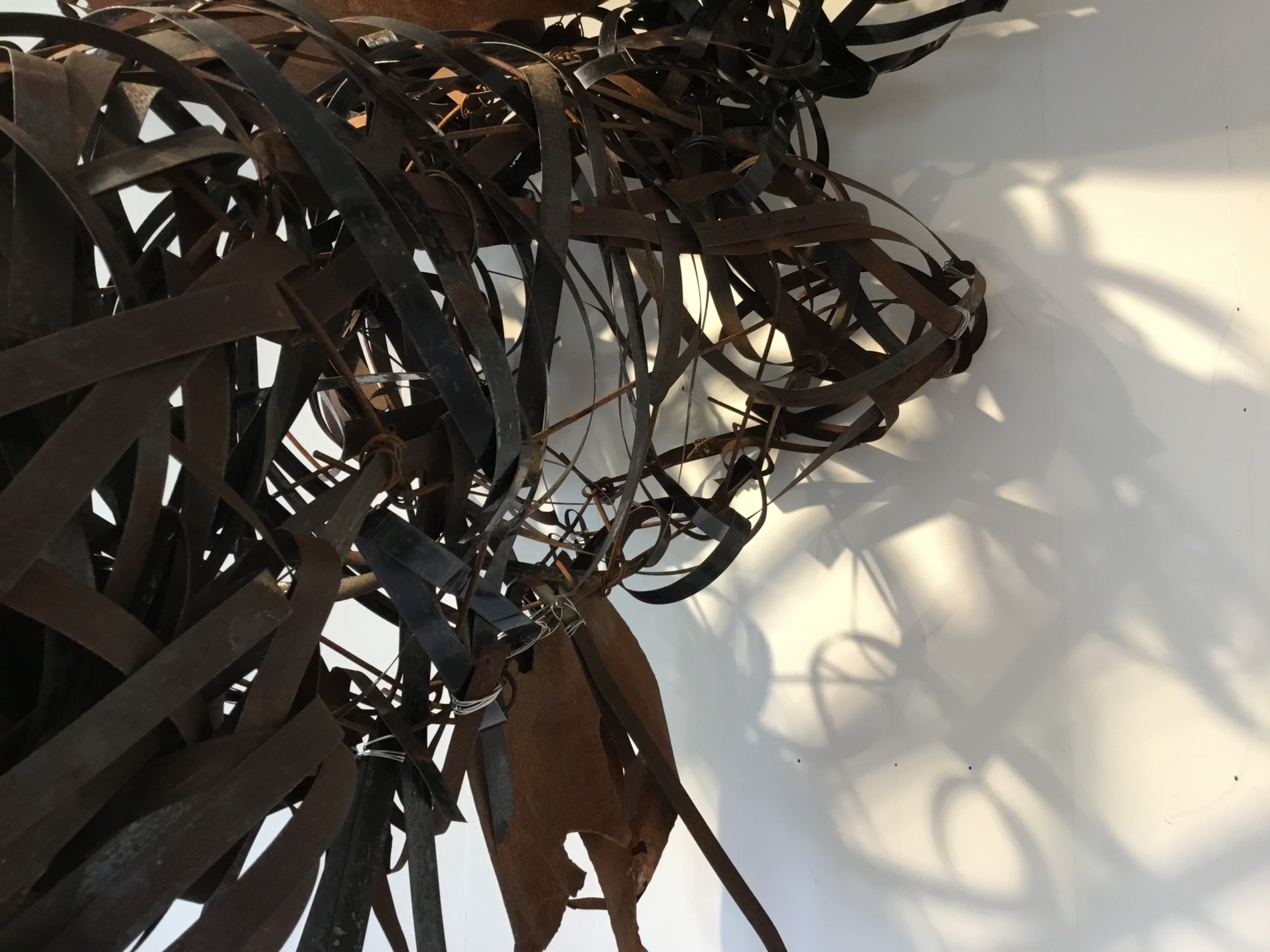 moose musings by BarbaraHouston ArtStudio  Image: Upcycled steel heat shield + metal strapping, woven, not welded