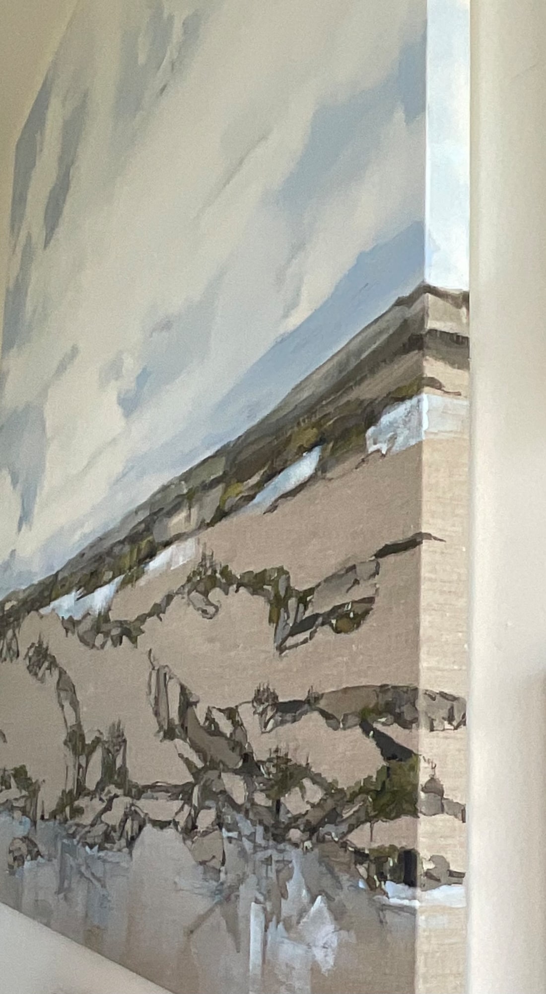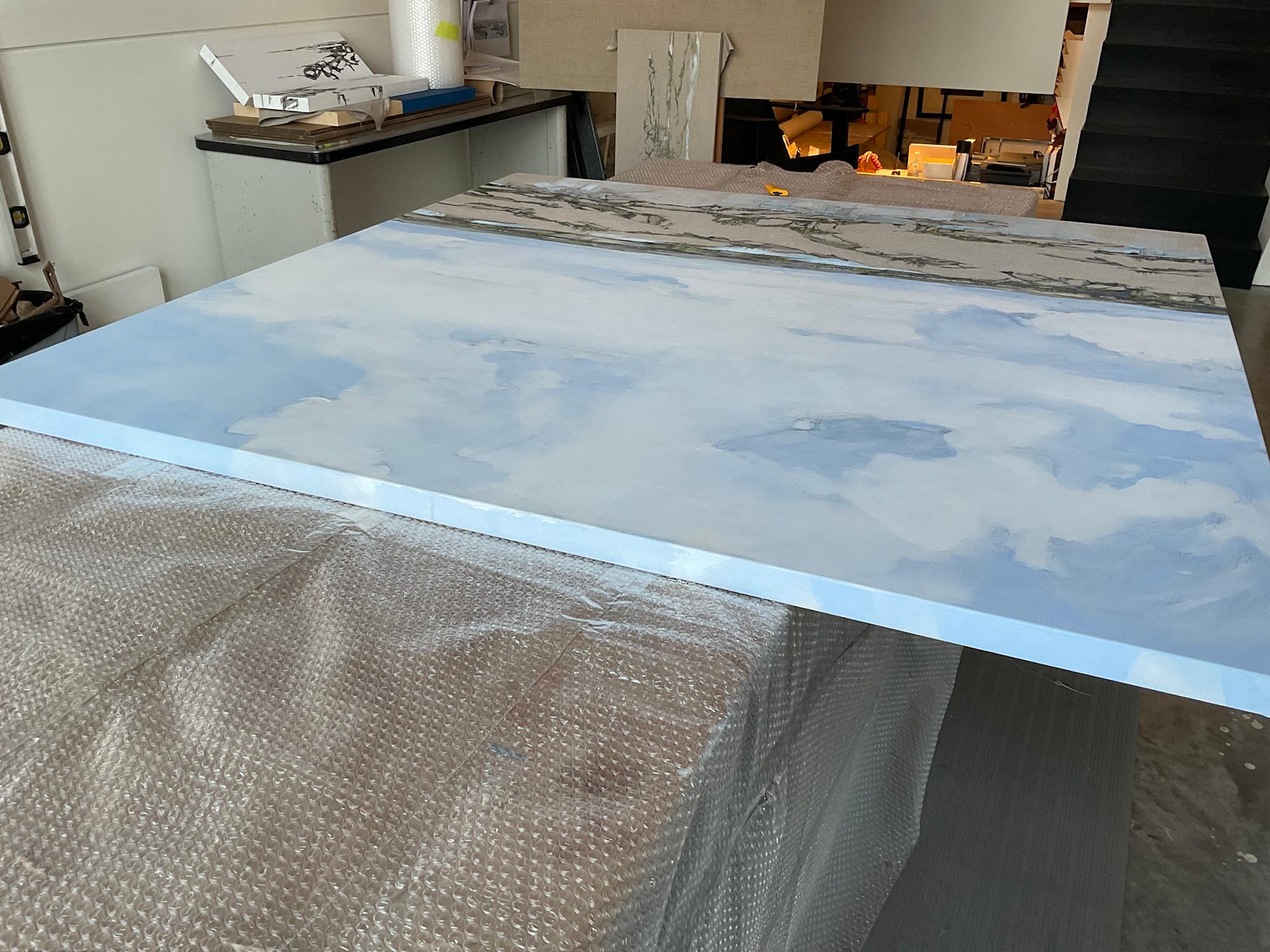 Conceptually Houston stitches white gessoed canvas (SKY) and the warm tones of the Belgian Linen (GROUND); the stitches pulled tight became the visual texture of the black spruce and tamarack along the horizon she imagines far in the distance. Positioning of the horizon line initiates the composition; the canvas is stretched and set for painting, clear gesso is applied to stabilize both materials. The ‘painted colour’ of the canvas meets the linen and begins the positive/negative composition. Unpainted areas create a tension between representational specificity and the space of unpainted canvas inviting the viewer remember and see.