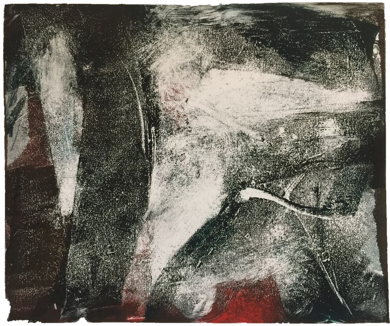 Mixed process monotype print in black-and-white with undertones, and bright spots of red.Moody, with visual texture. In all my work, I am fascinated by the process and inspiration; subjects are always open to interpretation.